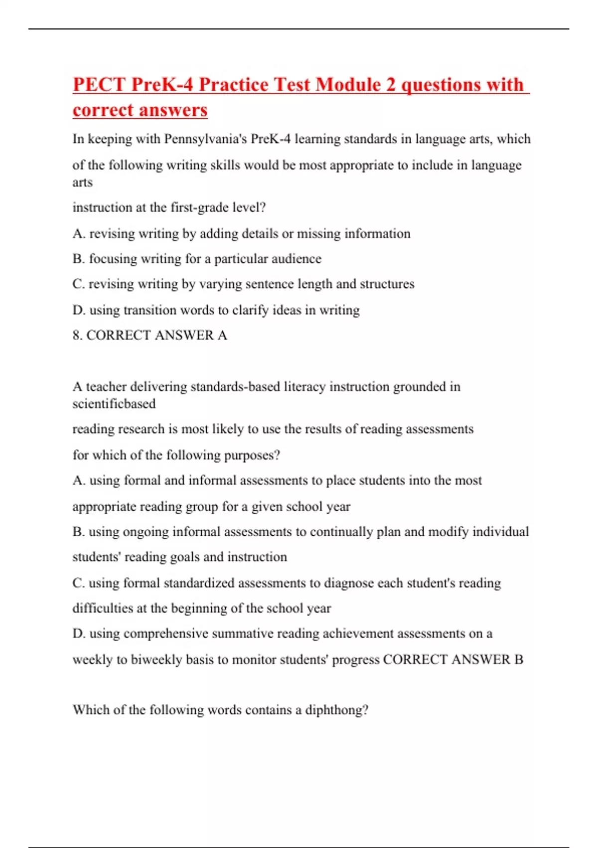 In keeping with Pennsylvania's PreK-4 learning standards in language arts, which of the following writing skills would be most appropriate to include in language arts instruction at the first-grade level? A. revising writing by adding details or missing information B. focusing writing for a particular audience C. revising writing by varying sentence length and structures D. using transition words to clarify ideas in writing 8. CORRECT ANSWER A A teacher delivering standards-based literacy instruction grounded in scientificbased reading research is most likely to use the results of reading assessments for which of the following purposes? A. using formal and informal assessments to place students into the most appropriate reading group for a given school year B. using ongoing informal assessments to continually plan and modify individual students' reading goals and instruction C. using formal standardized assessments to diagnose each student's reading difficulties at the beginning of the school year D. using comprehensive summative reading achievement assessments on a weekly to biweekly basis to monitor students' progress CORRECT ANSWER B Which of the following words contains a dip
