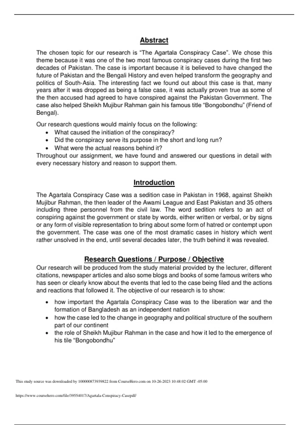Abstract The chosen topic for our research is “The Agartala Conspiracy Case”. We chose this theme because it was one of the two most famous conspiracy cases during the first two decades of Pakistan. The case is important because it is believed to have changed the future of Pakistan and the Bengali History and even helped transform the geography and politics of South-Asia. The interesting fact we found out about this case is that, many years after it was dropped as being a false case, it was actually proven true as some of the then accused had agreed to have conspired against the Pakistan Government. The case also helped Sheikh Mujibur Rahman gain his famous title “Bongobondhu” (Friend of Bengal). Our research questions would mainly focus on the following: What caused the initiation of the conspiracy? Did the conspiracy serve its purpose in the short and long run? What were the actual reasons behind it? Throughout our assignment, we have found and answered our questions in detail with every necessary history and reason to support them. Introduction The Agartala Conspiracy Case was a sedition case in Pakistan in 1968, against Sheikh Mujibur Rahman, the then leader of the Awami League and East Pakistan and 35 others including three personnel from the civil law. The word sedition refers to an act of conspiring against the government or state by words, either written or verbal, or by signs or any form of visible representation to bring about some form of hatred or contempt upon the government. The case was one of the most dramatic cases in history which went rather unsolved in the end, until several decades later, the truth behind it was revealed. Research Questions / Purpose / Objective Our research will be produced from the study material provided by the lecturer, different citations, newspaper articles and also some blogs and books of some famous writers who has seen or clearly know about the events that led to the case being filed and the actions and reactions that followed it. The objective of our research is to show: how important the Agartala Conspiracy Case was to the liberation war and the formation of Bangladesh as an independent nation how the case led to the change in geography and political structure of the southern part of our continent the role of Sheikh Mujibur Rahman in the case and how it led to the emergence of his tile “Bongobondhu” This study source was downloaded by from CourseH on :48:02 GMT -05:00 The key areas that we intend to focus on are: the reason behind the case being filed everyone that was accused in the case the role of some important faces in the case Our chief enquiry on the research would be to find the reason behind the political leaders of East Pakistan wanting to revolt against the government. Methodology/ Theoretical Overview The resources that we intend to use are the study materials, books and internet. We want to evaluate our research based on the source of all publishers, the confessions or revelations made by the accused and the degree o