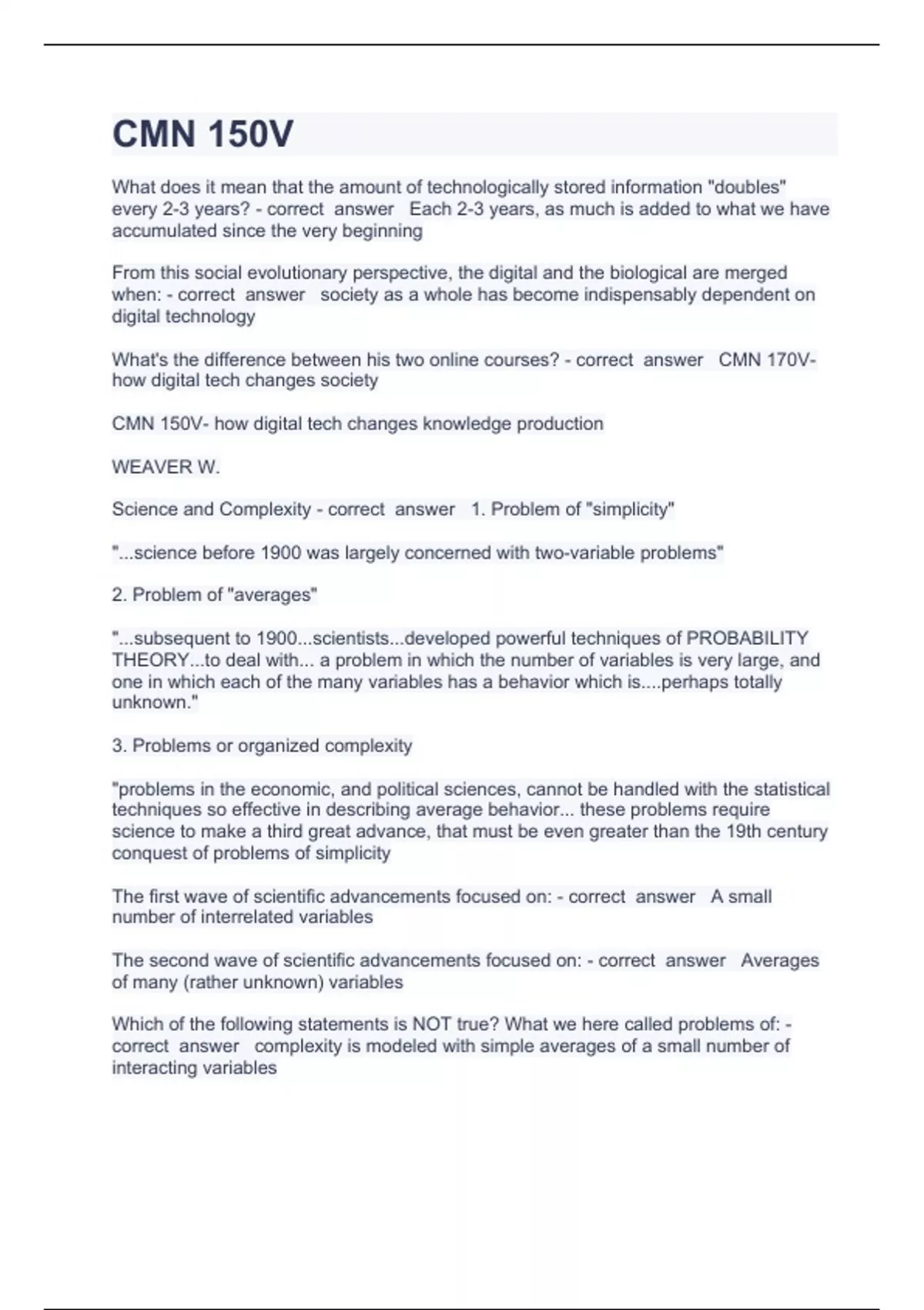 CMN 150V Question and answers correctly solved 2023What does it mean that the amount of technologically stored information "doubles" every 2-3 years? - correct answer Each 2-3 years, as much is added to what we have accumulated since the very beginning From this social evolutionary perspective, the digital and the biological are merged when: - correct answer society as a whole has become indispensably dependent on digital technology What's the difference between his two online courses? - correct answer CMN 170V- how digital tech changes society