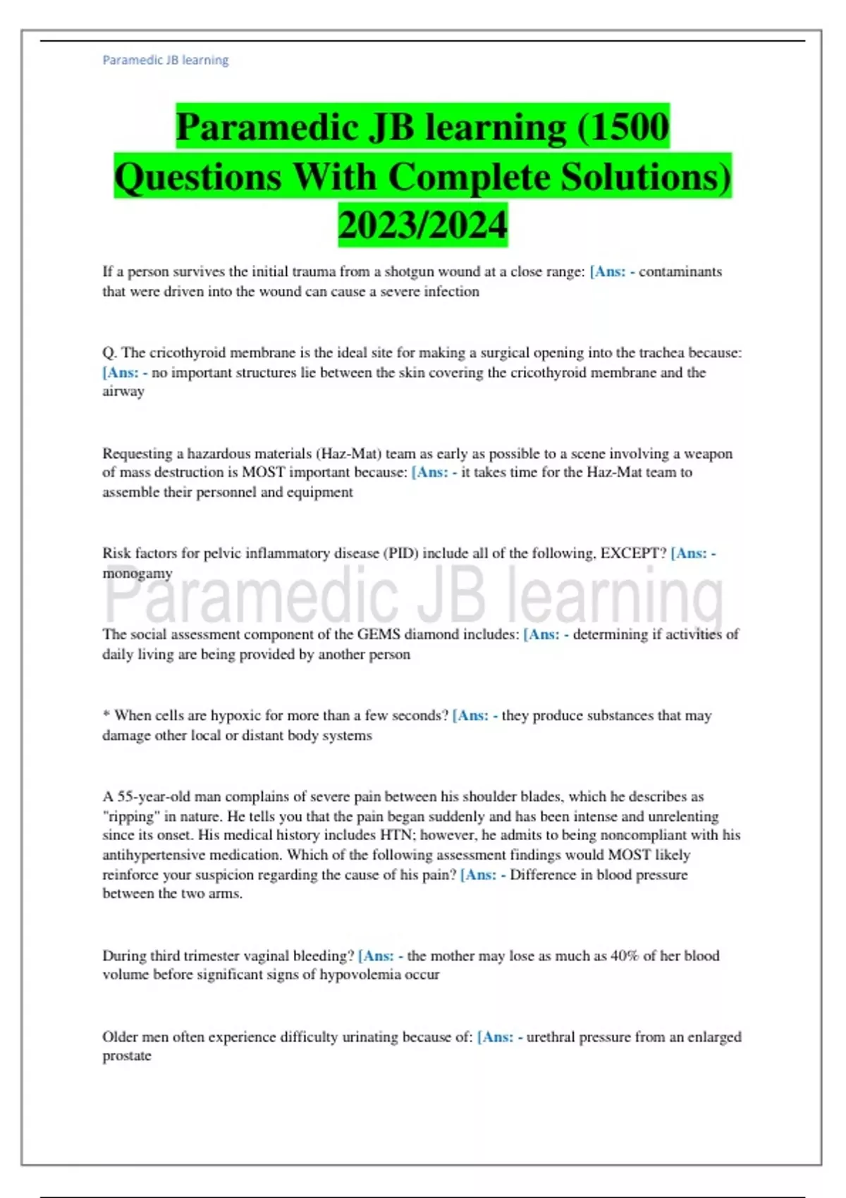 Paramedic JB learning (1500 Questions With Complete Solutions) 2023/2024Paramedic JB learning (1500 Questions With Complete Solutions) 2023/2024 If a person survives the initial trauma from a shotgun wound at a close range: [Ans: - contaminants that were driven into the wound can cause a severe infection Q. The cricothyroid membrane is the ideal site for making a surgical opening into the trachea because: [Ans: - no important structures lie between the skin covering the cricothyroid membrane and the airway Requesting a hazardous materials (Haz-Mat) team as early as possible to a scene involving a weapon of mass destruction is MOST important because: [Ans: - it takes time for the Haz-Mat team to assemble their personnel and equipment Risk factors for pelvic inflammatory disease (PID) include all of the following, EXCEPT? [Ans: - monogamy The social assessment component of the GEMS diamond includes: [Ans: - determining if activities of daily living are being provided by another person * When cells are hypoxic for more than a few seconds? [Ans: - they produce substances that may damage other local or distant body systems A 55-year-old man complains of severe pain between his shoulder blades, which he describes as "ripping" in nature. He tells you that the pain began suddenly and has been intense and unrelenting since its onset. His medical history includes HTN; however, he admits to being noncompliant with his antihypertensive medication. Which of the following assessment findings would MOST likely reinforce your suspicion regarding the cause of his pain? [Ans: - Difference in blood pressure between the two arms. During third trimester vaginal bleeding? [Ans: - the mother may lose as much as 40% of her blood volume before significant signs of hypovolemia occur Older men often experience difficulty urinating because of: [Ans: - urethral pressure from an enlarged prostate People who call 911 at the moment of a loved one's death MOST often needed? [Ans: - information and support Q. Intrapulmonary shunting occurs when: [Ans: - nonfunctional alveoli inhibit pulmonary gas exchange The recommended dose and method for administering naloxone to a patient who overdosed on a narcotic and is unresponsive and hypoventilating is: [Ans: - 2 mg injected slowly until the patient's respirations improve
