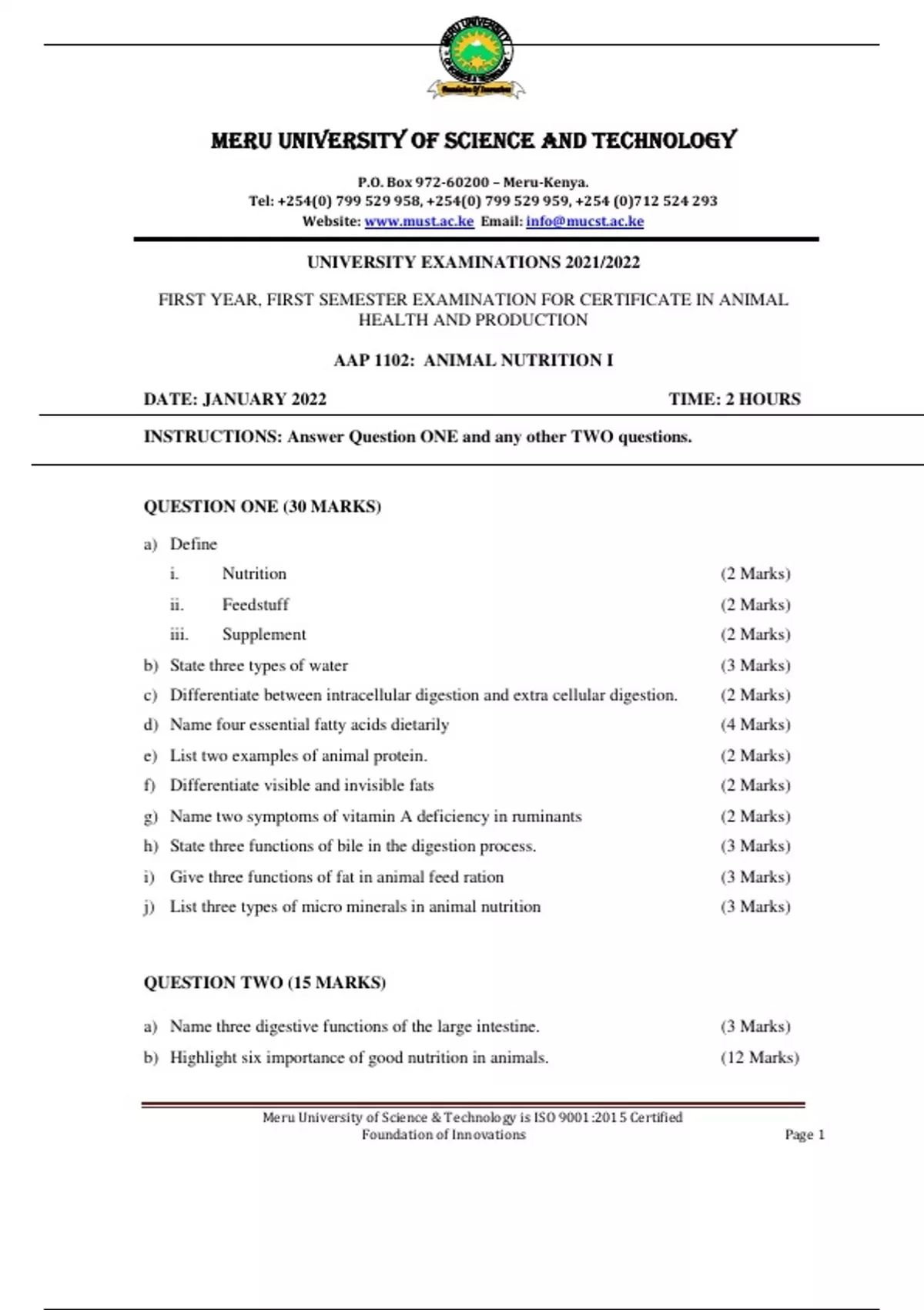 AAP 1102: ANIMAL NUTRITION I