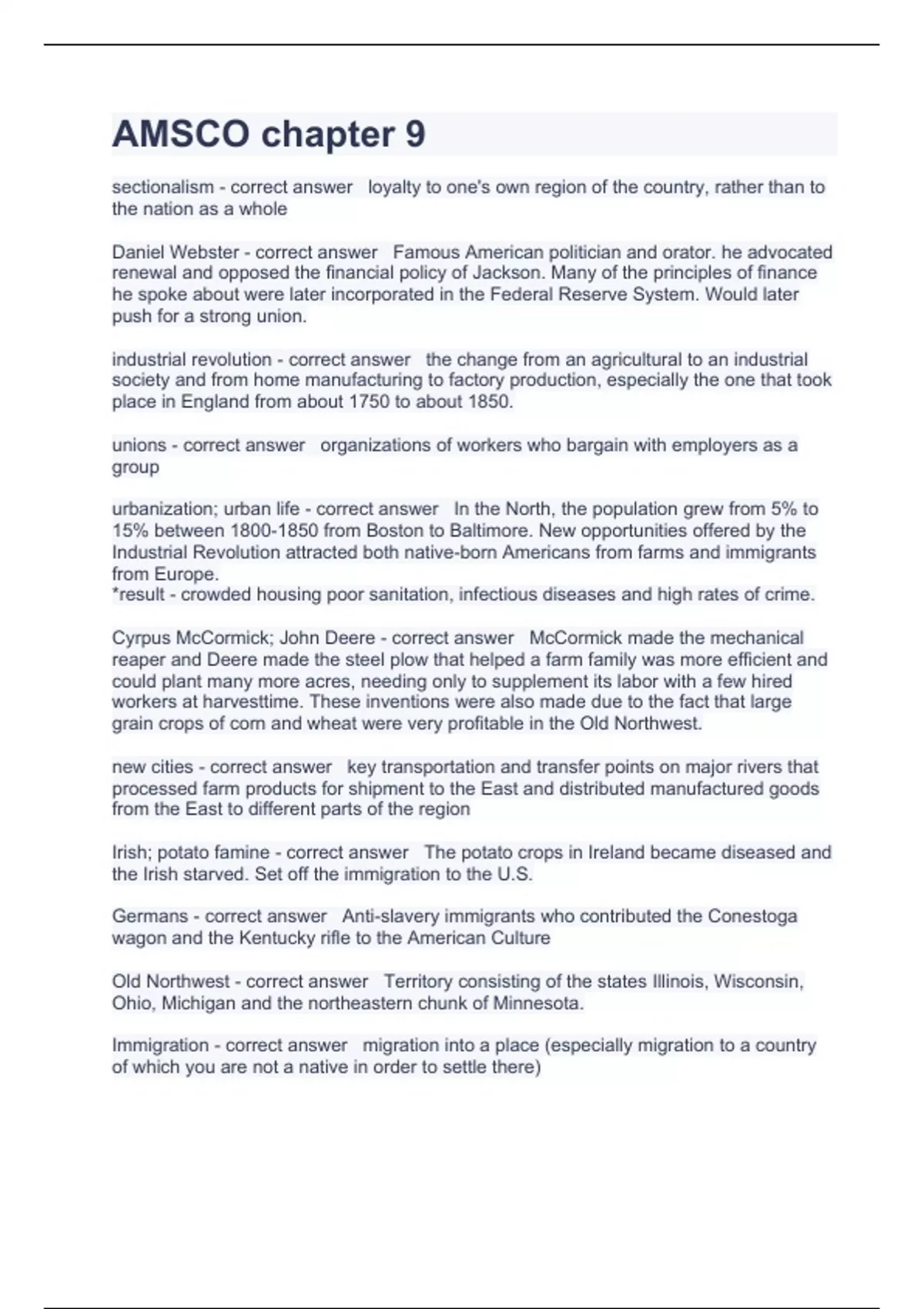 AMSCO chapter 9 Question andsectionalism - correct answer loyalty to one's own region of the country, rather than to the nation as a whole Daniel Webster - correct answer Famous American politician and orator. he advocated renewal and opposed the financial policy of Jackson. Many of the principles of finance he spoke about were later incorporated in the Federal Reserve System. Would later push for a strong union. answers correctly solved 2023/2024