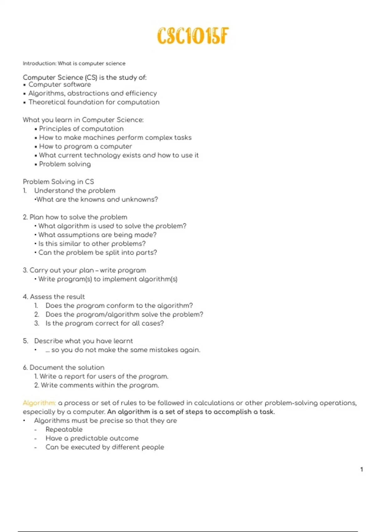 ALL THE NOTES YOU WILL NEED TO PASS THE EXAM. First-year first-semester computer science notes, all chapters start to finish. Notes made from the lecture slides, textbook and lecturer talking points thus making them in-depth and comprehensive.