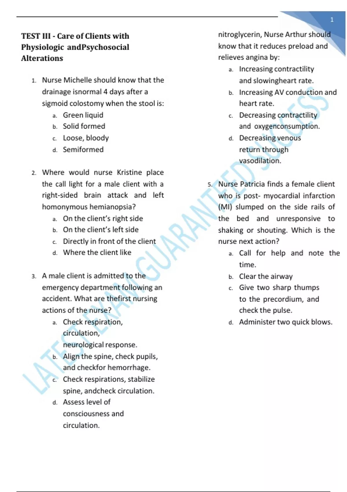 TEST III - Care of Clients with Physiologic andPsychosocial Alterations 1. Nurse Michelle should know that the drainage isnormal 4 days after a sigmoid colostomy when the stool is: a. Green liquid b. Solid formed c. Loose, bloody d. Semiformed 2. Where would nurse Kristine place the call light for a male client with a right-sided brain attack and left homonymous hemianopsia? a. On the client’s right side b. On the client’s left side c. Directly in front of the client d. Where the client like 3. A male client is admitted to the emergency department following an accident. What are thefirst nursing actions of the nurse? a. Check respiration, circulation, neurological response. b. Align the spine, check pupils, and checkfor hemorrhage. c. Check respirations, stabilize spine, andcheck circulation. d. Assess level of consciousness and circulation. nitroglycerin, Nurse Arthur should know that it reduces preload and relieves angina by: a. Increasing contractility and slowingheart rate. b. Increasing AV conduction and heart rate. c. Decreasing contractility and oxygenconsumption. d. Decreasing venous return through vasodilation. 5. Nurse Patricia finds a female client who is post- myocardial infarction (MI) slumped on the side rails of the bed and unresponsive to shaking or shouting. Which is the nurse next action? a. Call for help and note the time. b. Clear the airway c. Give two sharp thumps to the precordium, and check the pulse. d. Administer two quick blows. 4. In evaluating the effect of 290 6. Nurse Monett is caring for a client recoveringfrom gastro-intestinal bleeding. The nurse should: a. Plan care so the client can receive 8 hours of uninterrupted sleep each night. b. Monitor vital signs every 2 hours. c. Make sure that the client takes food andmedications at prescribed intervals. d. Provide milk every 2 to 3 hours. 7. A male client was on warfarin (Coumadin) beforeadmission, and has been receiving heparin I.V. for 2 days. The partial thromboplastin time (PTT)is 68 seconds. What should Nurse Carla do? a. Stop the I.V. infusion of heparin andnotify the physician. b. Continue treatment as ordered. c. Expect the warfarin to increase the PTT. d. Increase the dosage, because the level islower than normal. 8. A client undergone ileostomy, when should thedrainage appliance be applied to the stoma? a. 24 hours later, when edema hassubsided. b. In the operating room. c. After the ileostomy begin to function. d. When the client is able to begin self-careprocedures. 9. A client undergone spinal anesthetic, it will be important that the nurse immediately position the client in: a. On the side, to prevent obstruction of airway by tongue. b. Flat on back. c. On the back, with knees flexed 15degrees. d. Flat on the stomach, with the head turned to the side. 10. While monitoring a male client several hours after a motor vehicle accident, which assessment data suggest increasing intracranial pressure? a. Blood pressure is decreased from160/90 to 110/70. b. Pulse is increased from 87 to 95, with anoccasional skipped beat. c. The client is oriented when arousedfrom sleep, and goes back to sleep immediately. 291 d. The client refuses dinner because ofanorexia. 11. Mrs. Cruz, 80 years old is diagnosed with pneumonia. Which of the following symptomsmay appear first? a. Altered mental status and dehydration b. Fever and chills c. Hemoptysis and Dyspnea d. Pleuritic chest pain and cough 12. A male client has active tuberculosis (TB). Whichof the following symptoms will be exhibit? a. Chest and lower back pain b. Chills, fever, night sweats, andhemoptysis c. Fever of more than 104°F (40°C) andnausea d. Headache and photophobia 13. Mark, a 7-year-old client is brought to the emergency department. He’s tachypneic and afebrile and has a respiratory rate of 36 breaths/minute and has a nonproductive cough. He recently had a cold. Form this history; the client may have which of the following conditions? a. Acute asthma b. Bronchial pneumonia c. Chronic obstructive pulmonary disease(COPD) d. Emphysema 14. Marichu was given morphine sulfate for pain. She is sleeping and her respiratory rate is 4 breaths/minute. If action isn’t taken quickly, she might have which of the following reactions? a. Asthma attack b. Respiratory arrest c. Seizure d. Wake up on his own 15. A 77-year-old male client is admitted for electiveknee surgery. Physical examination reveals shallow respirations but no sign of respiratory distress. Which of the following is a normal physiologic change related to aging? a. Increased elastic recoil of the lungs b. Increased number of functionalcapillaries in the alveoli c. Decreased residual volume d. Decreased vital capacity 16. Nurse John is caring for a male client receivinglidocaine I.V. Which factor is the most relevant to administration of this medication? a. Decrease in arterial oxygen saturation(SaO2) when measured with a pulse oximeter. b. Increase in systemic blood pressure. c. Presence of premature ventricularcontractions (PVCs) on a cardiac monitor. d. Increase in intracranial pressure (ICP). 17. Nurse Ron is caring for a male client taking an anticoagulant. The nurse should teach the clientto: a. Report incidents of diarrhea. b. Avoid foods high in vitamin K c. Use a straight razor when shaving. d. Take aspirin to pain relief. 18. Nurse Lhynnette is preparing a site for the insertion of an I.V. catheter. The nurse shouldtreat excess hair at the site by: a. Leaving the hair intact b. Shaving the area c. Clipping the hair in the area d. Removing the hair with a depilatory. 19. Nurse Michelle is caring for an elderly female with osteoporosis. When teaching the client, thenurse should include information about which major complication: a. Bone fracture b. Loss of estrogen c. Negative calcium balance d. Dowager’s hump 20. Nurse Len is teaching a group of women to perform BSE. The nurse should explain that thepurpose of performing the examination is to discover: a. Cancerous lumps b. Ar