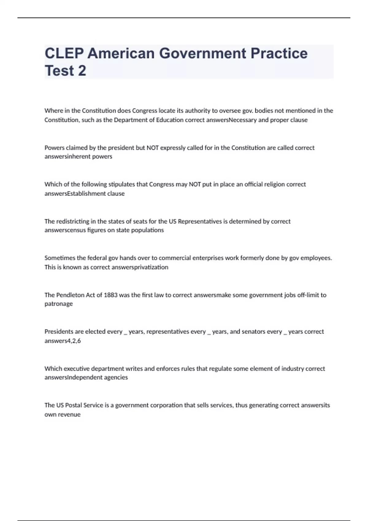 Where in the Constitution does Congress locate its authority to oversee gov. bodies not mentioned in the Constitution, such as the Department of Education correct answersNecessary and proper clause Powers claimed by the president but NOT expressly called for in the Constitution are called correct answersinherent powers Which of the following stipulates that Congress may NOT put in place an official religion correct answersEstablishment clause The redistricting in the states of seats for the US Representatives is determined by correct answerscensus figures on state populations Sometimes the federal gov hands over to commercial enterprises work formerly done by gov employees. This is known as correct answersprivatization The Pendleton Act of 1883 was the first law to correct answersmake some government jobs off-limit to patronage Presidents are elected every _ years, representatives every _ years, and senators every _ years correct answers4,2,6 Which executive department writes and enforces rules that regulate some element of industry correct answersIndependent agencies The US Postal Service is a government corporation that sells services, thus generating correct answersits own revenue