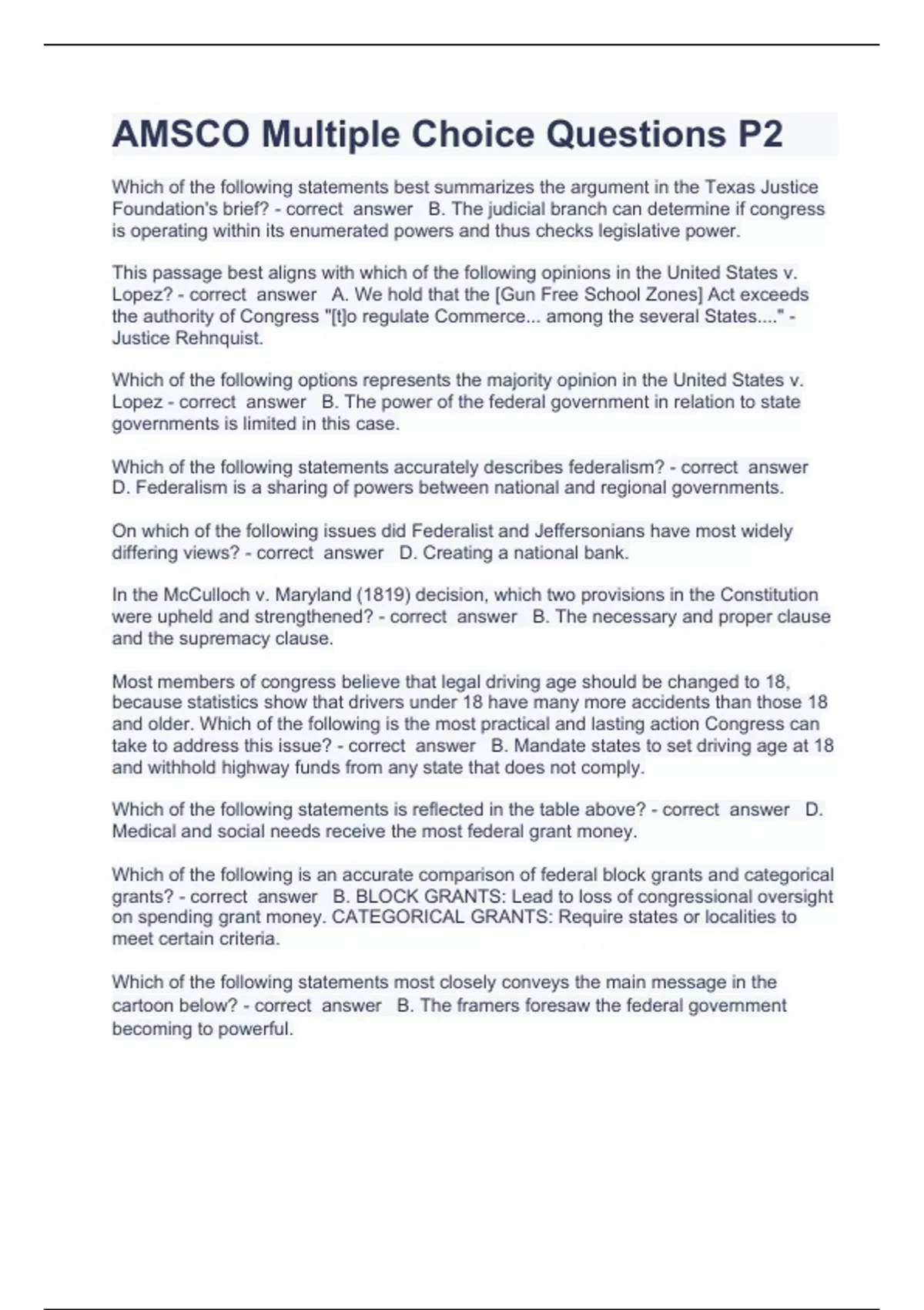 AMSCO Multiple Choice Questions P2 Question and answers correctly solved 2023/2024Which of the following statements best summarizes the argument in the Texas Justice Foundation's brief? - correct answer B. The judicial branch can determine if congress is operating within its enumerated powers and thus checks legislative power. This passage best aligns with which of the following opinions in the United States v. Lopez? - correct answer A. We hold that the [Gun Free School Zones] Act exceeds the authority of Congress "[t]o regulate Commerce... among the several States...." - Justice Rehnquist. Which of the following options represents the majority opinion in the United States v. Lopez - correct answer B. The power of the federal government in relation to state governments is limited in this case. Which of the following statements accurately describes federalism? - correct answer D. Federalism is a sharing of powers between national and regional governments. On which of the following
