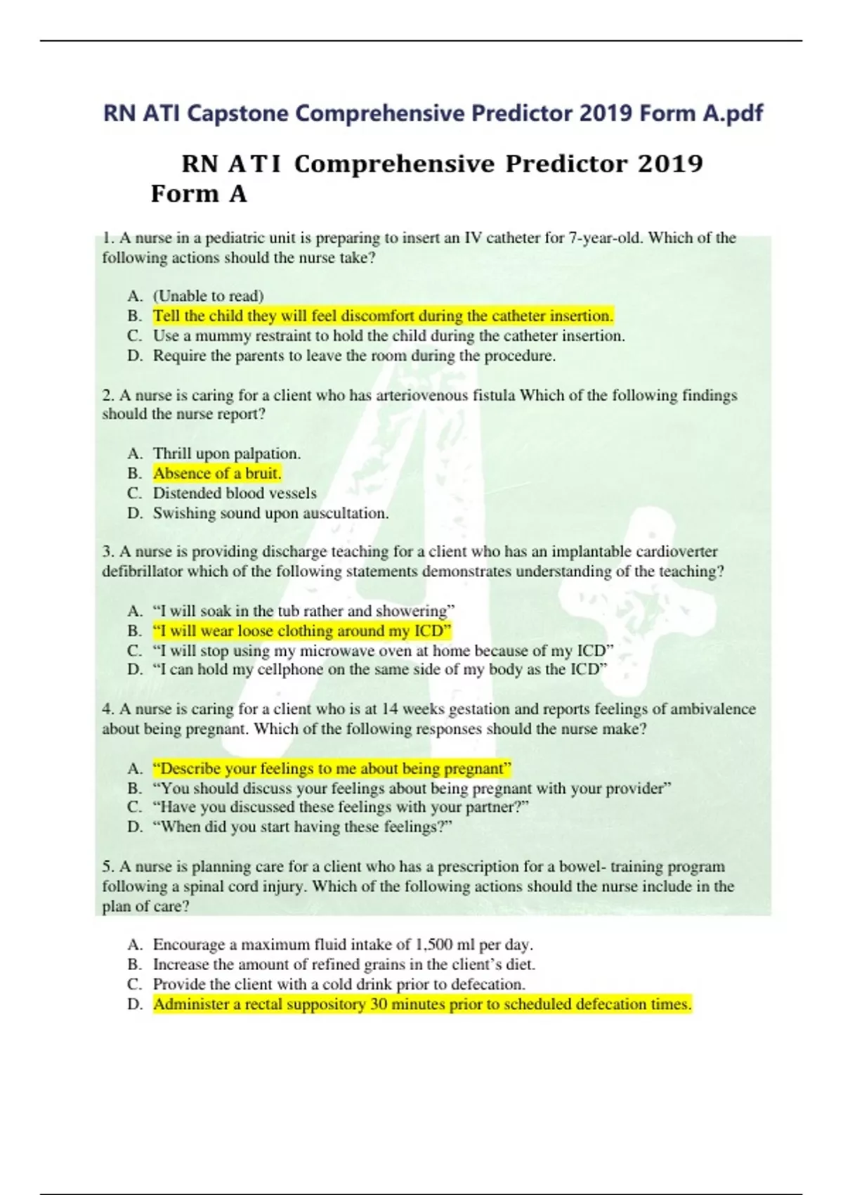 RN ATI Capstone Comprehensive Predictor 2019 Form A.pdf RN A T I Comprehensive Predictor 2019 Form A 1. A nurse in a pediatric unit is preparing to insert an IV catheter for 7-year-old. Which of the following actions should the nurse take? A. (Unable to read) B. Tell the child they will feel discomfort during the catheter insertion. C. Use a mummy restraint to hold the child during the catheter insertion. D. Require the parents to leave the room during the procedure. 2. A nurse is caring for a client who has arteriovenous fistula Which of the following findings should the nurse report? A. Thrill upon palpation. B. Absence of a bruit. C. Distended blood vessels D. Swishing sound upon auscultation. 3. A nurse is providing discharge teaching for a client who has an implantable cardioverter defibrillator which of the following statements demonstrates understanding of the teaching? A. “I will soak in the tub rather and showering” B. “I will wear loose clothing around my ICD” C. “I will stop using my microwave oven at home because of my ICD” D. “I can hold my cellphone on the same side of my body as the ICD” 4. A nurse is caring for a client who is at 14 weeks gestation and reports feelings of ambivalence about being pregnant. Which of the following responses should the nurse make? A. “Describe your feelings to me about being pregnant” B. “You should discuss your feelings about being pregnant with your provider” C. “Have you discussed these feelings with your partner?” D. “When did you start having these feelings?” 5. A nurse is planning care for a client who has a prescription for a bowel- training program following a spinal cord injury. Which of the following actions should the nurse include in the plan of care? A. Encourage a maximum fluid intake of 1,500 ml per day. B. Increase the amount of refined grains in the client’s diet. C. Provide the client with a cold drink prior to defecation. D. Administer a rectal suppository 30 minutes prior to scheduled defecation times