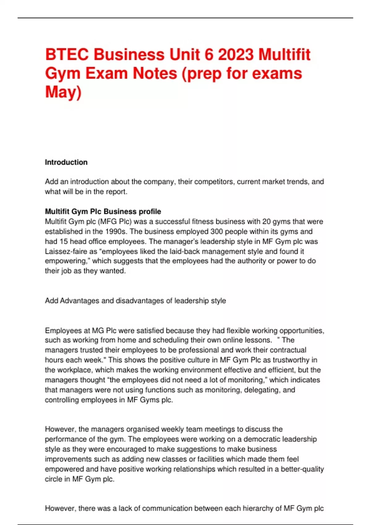 BTEC Business Unit 6 2023 Multifit Gym Exam Notes (prep for exams May) Introduction Add an introduction about the company, their competitors, current market trends, and what will be in the report. Multifit Gym Plc Business profile Multifit Gym plc (MFG Plc) was a successful fitness business with 20 gyms that were established in the 1990s. The business employed 300 people within its gyms and had 15 head office employees. The manager’s leadership style in MF Gym plc was Laissez-faire as “employees liked the laid-back management style and found it empowering,” which suggests that the employees had the authority or power to do their job as they wanted. Add Advantages and disadvantages of leadership style Employees at MG Plc were satisfied because they had flexible working opportunities, such as working from home and scheduling their own online lessons. ” The managers trusted their employees to be professional and work their contractual hours each week." This shows the positive culture in MF Gym Plc as trustworthy in the workplace, which makes the working environment effective and efficient, but the managers thought “the employees did not need a lot of monitoring,” which indicates that managers were not using functions such as monitoring, delegating, and controlling employees in MF Gyms plc. However, the managers organised weekly team meetings to discuss the performance of the gym. The employees were working on a democratic leadership style as they were encouraged to make suggestions to make business improvements such as adding new classes or facilities which made them feel empowered and have positive working relationships which resulted in a better-quality circle in MF Gym plc. However, there was a lack of communication between each hierarchy of MF Gym plc