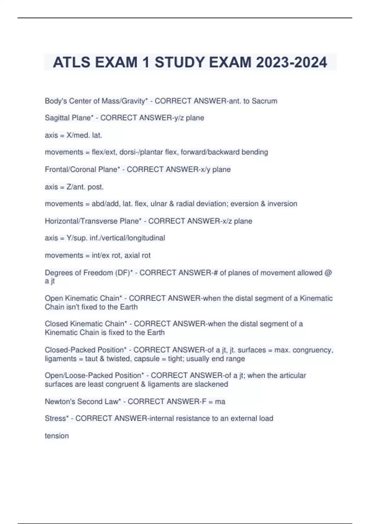 ATLS EXAM 1 STUDY EXAM Body's Center of Mass/Gravity* - CORRECT ANSWER-ant. to Sacrum Sagittal Plane* - CORRECT ANSWER-y/z plane axis = X/med. lat. movements = flex/ext, dorsi-/plantar flex, forward/backward bending Frontal/Coronal Plane* - CORRECT ANSWER-x/y plane axis = Z/ant. post. movements = abd/add, lat. flex, ulnar & radial deviation; eversion & inversion Horizontal/Transverse Plane* - CORRECT ANSWER-x/z plane axis = Y/sup. inf./vertical/longitudinal movements = int/ex rot, axial rot Degrees of Freedom (DF)* - CORRECT ANSWER-# of planes of movement allowed @ a jt Open Kinematic Chain* - CORRECT ANSWER-when the distal segment of a Kinematic Chain isn't fixed to the Earth Closed Kinematic Chain* - CORRECT ANSWER-when the distal segment of a Kinematic Chain is fixed to the Earth Closed-Packed Position* - CORRECT ANSWER-of a jt, jt. surfaces = max. congruency, ligaments = taut & twisted, capsule = tight; usually end range Open/Loose-Packed Position* - CORRECT ANSWER-of a jt; when the articular surfaces are least congruent & ligaments are slackened Newton's Second Law* - CORRECT ANSWER-F = ma Stress* - CORRECT ANSWER-internal resistance to an external load tension Strain* - CORRECT ANSWER-% ↑ in a tissue's stretched length relative to its original length stretch Nonlinear/Toe Region (of Muscle Stress-Strain Relationship)* - CORRECT ANSWERwhen under relatively slight strain (stretch), the ligament produces a small amount of stress (tension) = collagen fibers w/i the tissue are initially wavy/crimped → must be taut to measure significant tension Linear Region (of Muscle Stress-Strain Relationship)* - CORRECT ANSWER-= Y/X = stiffness ratio of stress (Y) caused by an applied strain (X) in the ligament Elastic Region (of Muscle Stress-Strain Relationship)* - CORRECT ANSWER-Nonlinear + Linear Region Elastic Deformation Energy* - CORRECT ANSWER-causes the Elastic Region, most of which is released when the force is removed/stops; tissue's original shape is recoverable Yield Point (of Muscle Stress-Strain Relationship)* - CORRECT ANSWER-beyond which ↑ strain → slight ↑ stress = plasticity → plastic deformation causes microscopic failure → tissue is permanently deformed Plasticity* - CORRECT ANSWER-of tissue, overstretch or over-compression Plastic Deformation Energy* - CORRECT ANSWER-causes the Plastic Region, tissue's original shape is not entirely recoverable Ultimate Failure Point (of Muscle Stress-Strain Relationship)* - CORRECT ANSWERwhen tissue partially or completely separates → loses ability to hold any tension (stress) Creep* - CORRECT ANSWER-an example of viscoelasticity, progressive strain on materials when exposed to constant load over time Force-Couple* - CORRECT ANSWER-when 2+ mm simultaneously produce forces in diff. linear directions → resulting torque acts in the same rotary direction 1st-Class Lever* - CORRECT ANSWER-axis of rot. btwn opposing forces 2nd-Class Lever* - CORRECT ANSWER-axis of rot. on an end & mm/internal force have ↑ leverage than external force, rare MA = 1 3rd-Class Lever* - CORRECT ANSWER-axis of rot. on an end & external forces have ↑ leverage than mm/internal force, most common MA = 1 Mechanical Advantage (MA)* - CORRECT ANSWER-of a lever, ratio of the internal moment/lever arm to the external moment/lever arm Newton's 1st Law (Inertia)* - CORRECT ANSWER-a body remains in motion around an axis of rot. or at rest unless an outside an external force changes its state Newton's 2nd Law (Acceleration)* - CORRECT ANSWER-linear acceleration of a body is directly proportional to the force causing it, is inversely proportional to the mass of the body, & takes place in the same direction as the applied force ΣF = m x a Newton's 3rd Law (Action-Reaction)* - CORRECT ANSWER-for every action there is an equal & opposite reaction Ligaments* - CORRECT ANSWER-made of regular dense connective tissue often blend w/ jt capsule, fibrous ct w/ nerve endings → important for reflex mech. & perception of movement & position composed of fibrocytes & type I collagen → less flexible bone to bone 3 classifications: capsular, extracapsular, & intracapsular Skeletal Muscle Fiber* - CORRECT ANSWER-2 types: Type I & Type II, intermingle in most mm but one (1) usually predominates depending on contractile properties of mm Type I Muscle Fibers* - CORRECT ANSWER-red, slow twitch, rich in mitochondria in postural mm (ex. erecter spinae & soleus) Type II Muscle Fibers* - CORRECT ANSWER-white, fast twitch, low in mitochondria in limb mm Tendons* - CORRECT ANSWER-made of regular dense connective tissue white fibrous bands, few blood vessels & supplied by sensory nerve fibers, great tensile strength → inelastic → resistant to stretch composed of tenocytes mm to bone Muscle-Tendon Junction - CORRECT ANSWER-changing from a highly vascular structure to a slightly vascular → common site for mm strai