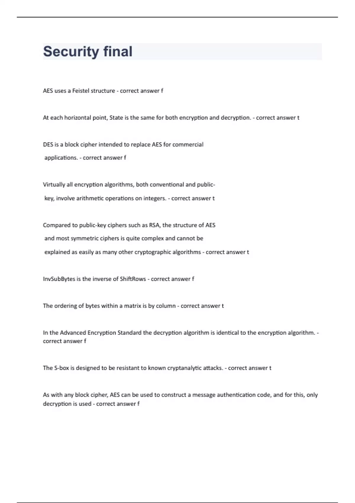 Security finalAES uses a Feistel structure - correct answer f At each horizontal point, State is the same for both encryption and decryption. - correct answer t DES is a block cipher intended to replace AES for commercial applications. - correct answer f Virtually all encryption algorithms, both conventional and public- key, involve arithmetic operations on integers. - correct answer t Compared to public-key ciphers such as RSA, the structure of AES and most symmetric ciphers is quite complex and cannot be explained as easily as many other cryptographic algorithms - correct answer t InvSubBytes is the inverse of ShiftRows - correct answer f The ordering of bytes within a matrix is by column - correct answer t In the Advanced Encryption Standard the decryption algorithm is identical to the encryption algorithm. - correct answer f The S-box is designed to be resistant to known cryptanalytic attacks. - correct answer t As with any block cipher, AES can be used to construct a message authentication code, and for this, only decryption is used - correct answer f The Rijndael developers designed the expansion key algorithm to be resistant to known cryptanalytic attacks. - correct answer t AES can be implemented very efficiently on an 8-bit processor. - correct answer t Plaintext is transformed into ciphertext using two keys and a decryption algorithm. - correct answer f Public-key encryption is more secure from cryptanalysis than symmetric encryption - correct answer f Much of the theory of public-key cryptosystems is based on number theory. - correct answer t If the authenticator is encrypted with the sender's private key, it serves as a signature that verifies origin, content, and sequencing. - correct answer t A trap-door one-way function is easy to calculate in one direction and infeasible to calculate in the other direction unless certain additional information is known. - correct answer t A public-key encryption scheme is not vulnerable to a brute-force attack. - correct answer f