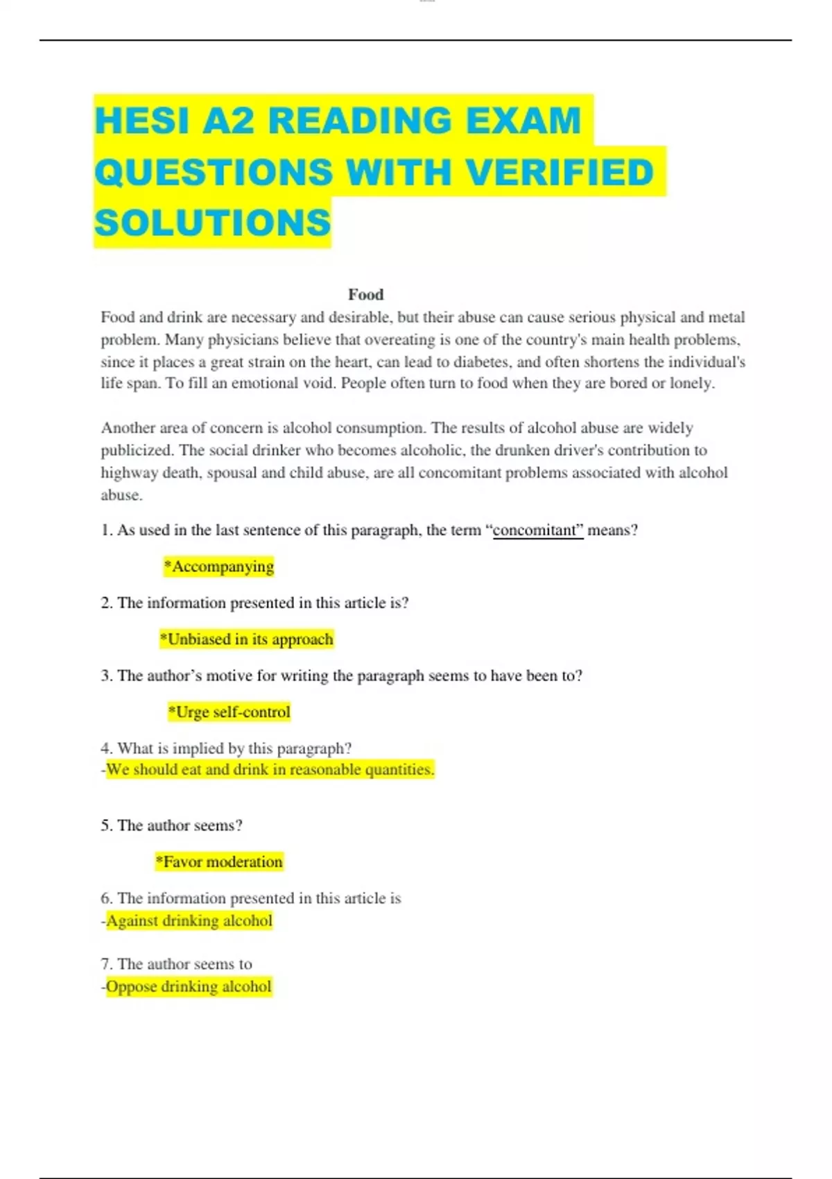 HESI A2 READING EXAM QUESTIONS WITH VERIFIED SOLUTIONS Food Food and drink are necessary and desirable, but their abuse can cause serious physical and metal problem. Many physicians believe that overeating is one of the country's main health problems, since it places a great strain on the heart, can lead to diabetes, and often shortens the individual's life span. To fill an emotional void. People often turn to food when they are bored or lonely. Another area of concern is alcohol consumption. The results of alcohol abuse are widely publicized. The social drinker who becomes alcoholic, the drunken driver's contribution to highway death, spousal and child abuse, are all concomitant problems associated with alcohol abuse. 1. As used in the last sentence of this paragraph, the term “concomitant” means? *Accompanying 2. The information presented in this article is? *Unbiased in its approach 3. The author’s motive for writing the paragraph seems to have been to? *Urge self-control 4. What is implied by this paragraph? -We should eat and drink in reasonable quantities. 5. The author seems? *Favor moderation 6. The information presented in this article is -Against drinking alcohol 7. The author seems to -Oppose drinking alcohol lOMoAR cPSD| Eating Consumption of food is a universal necessity. Different cultures have developed different methods to accomplish the task. It is interesting to discover these differences and learn new ways to do things. European cultures developed cutlery (knives, forks, and spoons) to enable people to efficiently eat their food. Correct use of this tool’s changes with the times-what was polite in 1800 may not be considered proper manners today. China developed the chopstick as an efficient tool for eating. Mastery of the use of chopsticks can be difficult for the person not raised in the culture. The attempts of a novice to use chopsticks can be very amusing to the watcher, but frustrating for the hungry diner. Space travel has created new challenges for consuming food. Squeeze bottles and other unique packaging have enabled space travelers to get their needed nutrition. Chopsticks and forks do not work well in space. 1.What conclusion can be drawn about the article? A. The author think chopstick are funny B. The best way to eat food is with cutlery C. The author explains differences in eating processes. (CORRECT) D. Space flight is fun and exciting. 2.What statement can be implied from the content of article? A. Eating in space can be time-consuming. B. Diversity is interesting to learn about C. The author thinks cutlery is the best tool to use to consume food. (correct) D. The author enjoys trying new food. 3.What is the best definition of efficient as used in the third paragraph? -productive without waste 4.What conclusion can be drawn about the article? -The author explain differences in eating processes. 5.What statement can be implied from the content of article. -Diversity is interesting to learn about