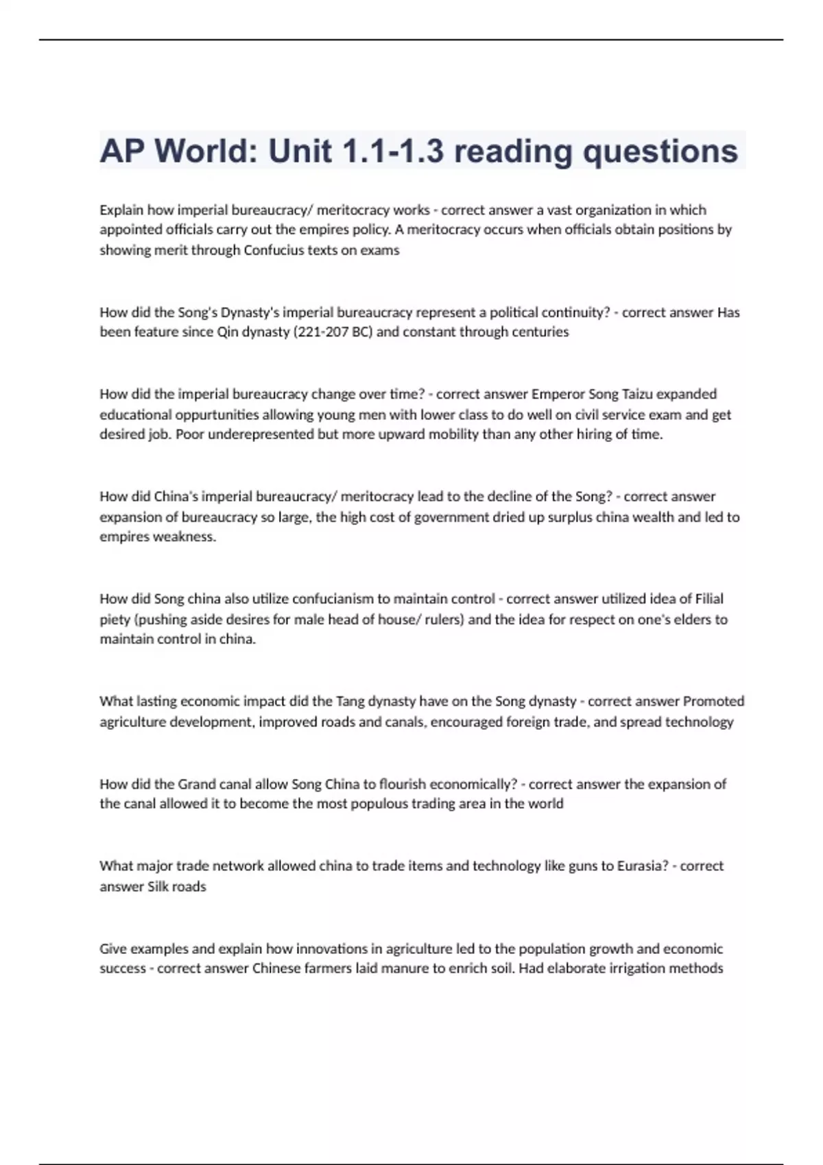 AP World Unit 1.1-1.3 reading questionsExplain how imperial bureaucracy/ meritocracy works - correct answer a vast organization in which appointed officials carry out the empires policy. A meritocracy occurs when officials obtain positions by showing merit through Confucius texts on exams How did the Song's Dynasty's imperial bureaucracy represent a political continuity? - correct answer Has been feature since Qin dynasty (221-207 BC) and constant through centuries How did the imperial bureaucracy change over time? - correct answer Emperor Song Taizu expanded educational oppurtunities allowing young men with lower class to do well on civil service exam and get desired job. Poor underepresented but more upward mobility than any other hiring of time. How did China's imperial bureaucracy/ meritocracy lead to the decline of the Song? - correct answer expansion of bureaucracy so large, the high cost of government dried up surplus china wealth and led to empires weakness. How did Song china also utilize confucianism to maintain control - correct answer utilized idea of Filial piety (pushing aside desires for male head of house/ rulers) and the idea for respect on one's elders to maintain control in china. What lasting economic impact did the Tang dynasty have on the Song dynasty - correct answer Promoted agriculture development, improved roads and canals, encouraged foreign trade, and spread technology How did the Grand canal allow Song China to flourish economically? - correct answer the expansion of the canal allowed it to become the most populous trading area in the world What major trade network allowed china to trade items and technology like guns to Eurasia? - correct answer Silk roads Give examples and explain how innovations in agriculture led to the population growth and economic success - correct answer Chinese farmers laid manure to enrich soil. Had elaborate irrigation methods (ditches, water wheels, terraces). Heavy plows by Water Buffalo/ Oxen allowed unusable land to be cultivated. Methods created food surplus and fast growing pops. How did steel impact Song China? - correct answer Used to reinforce bridges, gates, ship anchors, religious items (Pagodas, Buddhist figures), strengthened agricultural equipment thus increasing food production and population. What 2 major developments allowed Song China to trade by sea? - correct answer 1) Atrisians manufactured porcelain and silk expanding trade networks 2) compass used in maritime navigation, ships able to carry more cargo, paper navigation charts made seafaring possible in open water list 3 other items of trade from Song China - correct answer porcelains, textiles, tea Explain what commercialization means for an economy - correct answer local consumption shifting to market production bringing chief exports to market. Stimulates trade internally and externally with technology. (Grand Canal and South China Sea) Explain how Song China promoted social growth of their commercial economy with taxes - correct answer Increased amount of money in circulation promoting economic growth because changed how public projects were built Explain how the tributary system supported the economic and political power for Song China. - correct answer required states to pay to honor Chinese emperor. Representatives sent to demonstrate respect with Kowtow. Fleets sent led by Zheng He to show power and receive tributes.