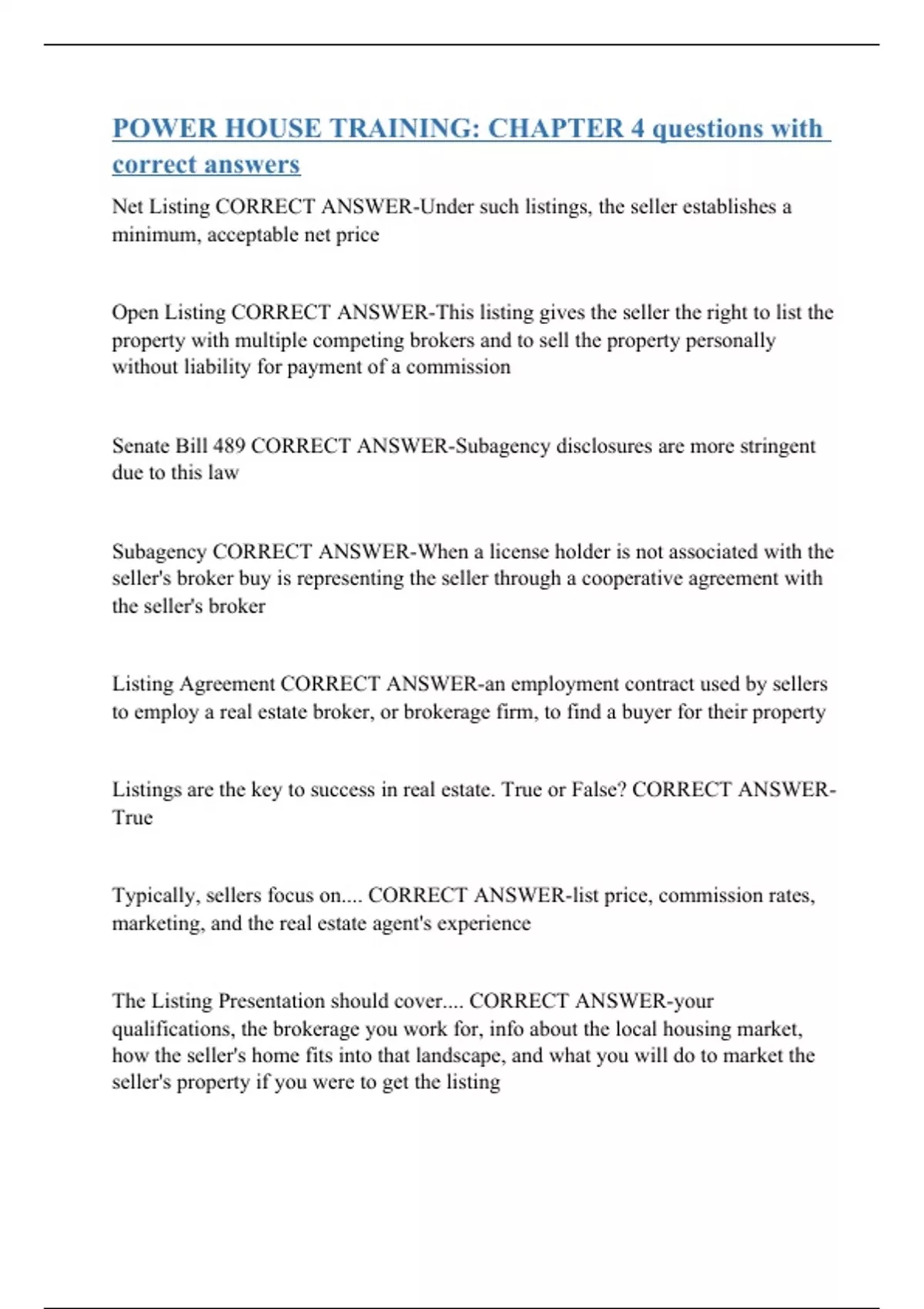 Net Listing CORRECT ANSWER-Under such listings, the seller establishes a minimum, acceptable net price Open Listing CORRECT ANSWER-This listing gives the seller the right to list the property with multiple competing brokers and to sell the property personally without liability for payment of a commission Senate Bill 489 CORRECT ANSWER-Subagency disclosures are more stringent due to this law Subagency CORRECT ANSWER-When a license holder is not associated with the seller's broker buy is representing the seller through a cooperative agreement with the seller's broker Listing Agreement CORRECT ANSWER-an employment contract used by sellers to employ a real estate broker, or brokerage firm, to find a buyer for their property Listings are the key to success in real estate. True or False? CORRECT ANSWER-True Typically, sellers focus on.... CORRECT ANSWER-list price, commission rates, marketing, and the real estate agent's experience The Listing Presentation should cover.... CORRECT ANSWER-your qualifications, the brokerage you work for, info about the local housing market, how the seller's home fits into that landscape, and what you will do to market the seller's property if you were to get the listing