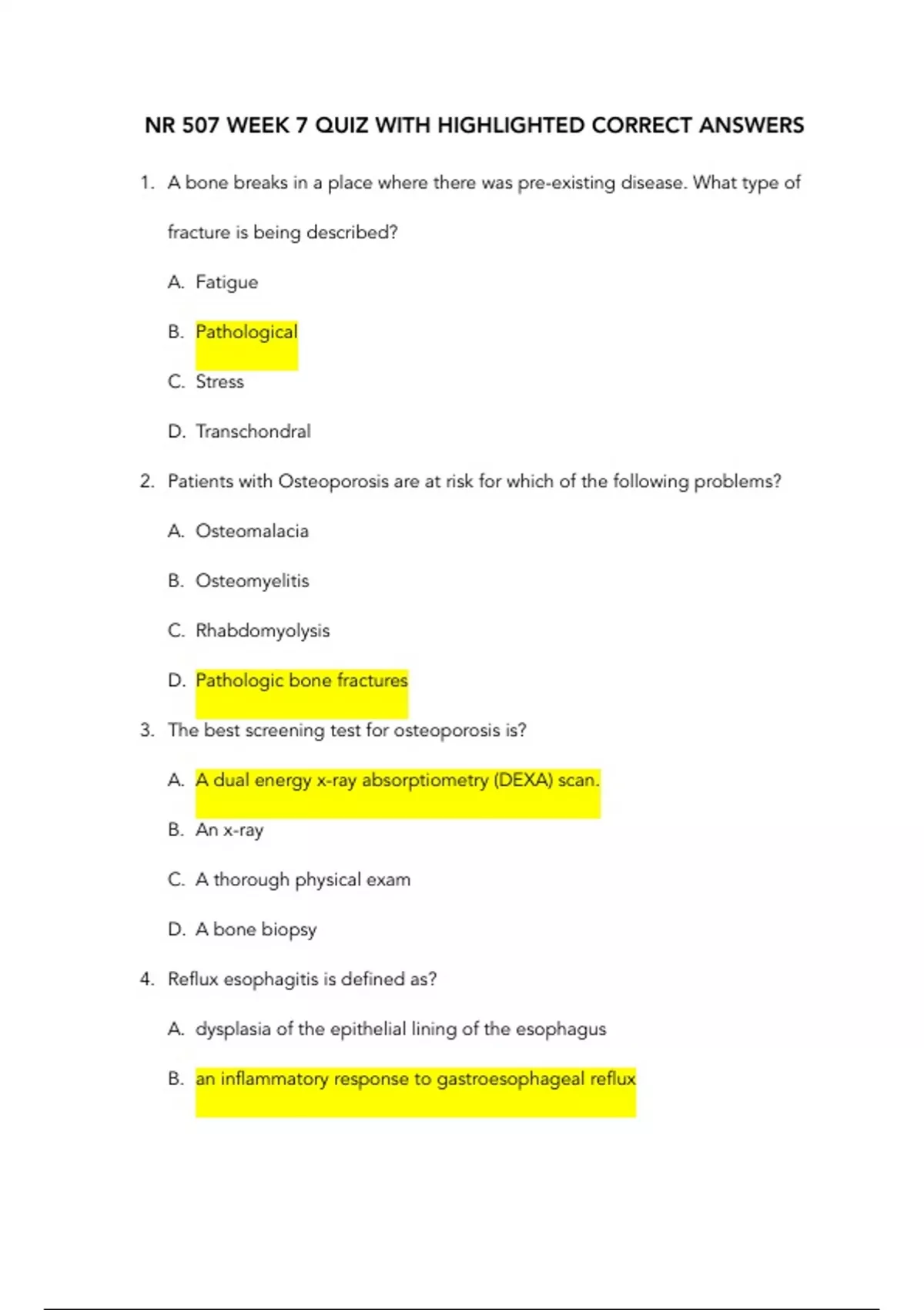 NR 507 WEEK 7 QUIZ WITH HIGHLIGHTED CORRECT ANSWERS 1. A bone breaks in a place where there was pre-existing disease. What type of fracture is being described? A. Fatigue B. Pathological C. Stress D. Transchondral 2. Patients with Osteoporosis are at risk for which of the following problems? A. Osteomalacia B. Osteomyelitis C. Rhabdomyolysis D. Pathologic bone fractures 3. The best screening test for osteoporosis is? A. A dual energy x-ray absorptiometry (DEXA) scan. B. An x-ray C. A thorough physical exam D. A bone biopsy 4. Reflux esophagitis is defined as? A. dysplasia of the epithelial lining of the esophagus B. an inflammatory response to gastroesophageal reflux