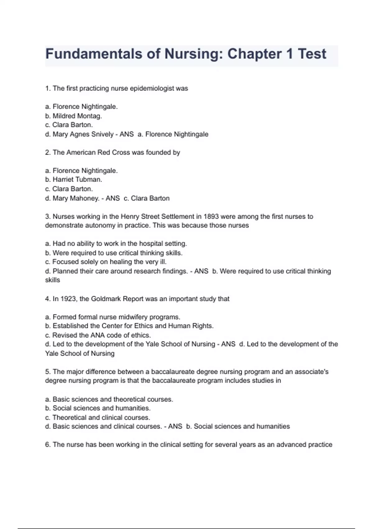 Fundamentals of Nursing: Chapter 1 Test 1. The first practicing nurse epidemiologist was a. Florence Nightingale. b. Mildred Montag. c. Clara Barton. d. Mary Agnes Snively - ANS a. Florence Nightingale 2. The American Red Cross was founded by a. Florence Nightingale. b. Harriet Tubman. c. Clara Barton. d. Mary Mahoney. - ANS c. Clara Barton 3. Nurses working in the Henry Street Settlement in 1893 were among the first nurses to demonstrate autonomy in practice. This was because those nurses a. Had no ability to work in the hospital setting. b. Were required to use critical thinking skills. c. Focused solely on healing the very ill. d. Planned their care around research findings. - ANS b. Were required to use critical thinking skills 4. In 1923, the Goldmark Report was an important study that a. Formed formal nurse midwifery programs. b. Established the Center for Ethics and Human Rights. c. Revised the ANA code of ethics. d. Led to the development of the Yale School of Nursing - ANS d. Led to the development of the Yale School of Nursing 5. The major difference between a baccalaureate degree nursing program and an associate's degree nursing program is that the baccalaureate program includes studies in a. Basic sciences and theoretical courses. b. Social sciences and humanities. c. Theoretical and clinical courses. d. Basic sciences and clinical courses. - ANS b. Social sciences and humanities 6. The nurse has been working in the clinical setting for several years as an advanced practice nurse and has earned her master's degree as a family nurse practitioner. However, she seems unfulfilled and has a strong desire to do research. To fulfill her desire, the nurse most likely would apply to attend a program that would lead to a a. Doctor of Nursing Science degree (DNSc). b. Doctor of Philosophy degree (PhD). c. Doctor of Nursing Practice degree (DNP). d. Doctor in the Science of Nursing degree (DSN). - ANS b. Doctor of Philosophy degree (PhD) 7. The nurse is caring for her patients and is focused on managing their care as opposed to managing and performing skills. This nurse demonstrates which level of proficiency according to Benner? a. Novice b. Competent c. Proficient d. Expert - ANS c. Proficient 8. Which of the following resources guides faculty on structure and evaluation of the nursing curriculum? a. ANA's Standards of Nursing Practice b. Essentials of Baccalaureate Education c. NLNAC Interpretive Guidelines d. Standards of Professional Performance - ANS b. Essentials of Baccalaureate Education 9. The nurse is caring for the patient who has had major abdominal surgery and also has a large sacral pressure sore. The nurse implements coughing and deep breathing exercises and consults the wound care specialist to evaluate and prescribe care for the pressure sore, even though no physician order has provided instructions to do so. In doing this, the nurse is implementing the element of a. Autonomy. b. Accountability. c. Advanced practice. d. Nurse practitioner. - ANS a. Autonomy 10. The physician is planning to take the patient to surgery in the morning and leaves an order for the nurse to get the patient to sign the surgical permit. The physician's note indicates that the patient has been educated on the procedure. However, the patient tells the nurse, "I have no idea what he's going to do. He rushed in and rushed out so fast, I couldn't ask any questions." The nurse does not allow the patient to sign the permit and calls the physician to inform him of the patient's statement. This is an example of the nurse acting as a. Patient advocate. b. Patient educator. c. Manager. d. Clinical nurse specialist. - ANS a. Patient advocate 11. The patient requires routine gynecological services after giving birth to her son, and while seeing the nurse midwife, she asks for a referral to a pediatrician for the newborn. The nurse midwife should a. Provide the referral as requested. b. Offer to provide the newborn care. c. Refer the patient to the supervising physician. d. Tell the patient that she cannot make referrals. - ANS b. Offer to provide the newborn care 12. The student nurse has a goal of becoming a certified registered nurse anesthetist (CRNA). It is important for the student to understand that the CRNA a. Works under the guidance of an anesthesiologist. b. Manages acute medical conditions. c. Manages gynecological services such as PAP smears. d. Must have a PhD degree in anesthesiology. - ANS a. Works under the guidance of an anesthesiologist 13. The nurse is speaking in front of a group of ninth grade students about nursing as a profession. One student states that she does not want to be a nurse because all nurses do is take care of sick people and play politics. The most appropriate response that the nurse could give and expand on is that a. Nursing is ideal for the person who hates politics. b. Nursing focuses on curing the person's disease. c. Nursing is not political because it has its own knowledge base. d. An area of nursing exists for every interest. - ANS d. An area of nursing exists for every interest 14. A bill has been submitted to the State House of Representatives that is designed to reduce the cost of health care by increasing the patient-to-nurse ratio from a maximum of 2:1 in intensive care units to 3:1. The nurse realizes that a. Legislation is politics beyond the nurse's control. b. National programs have no bearing on state politics. c. The individual nurse can influence legislative decisions. d. Focusing on nursing care provides the best patient benefit. - ANS c. The individual nurse can influence legislative decisions 15. During the American Civil War, which of the following women was active in the Underground Railroad movement and assisted in leading more than 300 slaves to freedom? a. Harriet Tubman b. Clara Barton c. Dorothea Dix d. Mary Ann Ball (Mother Bickerdyke) - ANS a. Harriet Tubman 16. Graduates of baccalaureate degree or associate's degree nursing programs are e