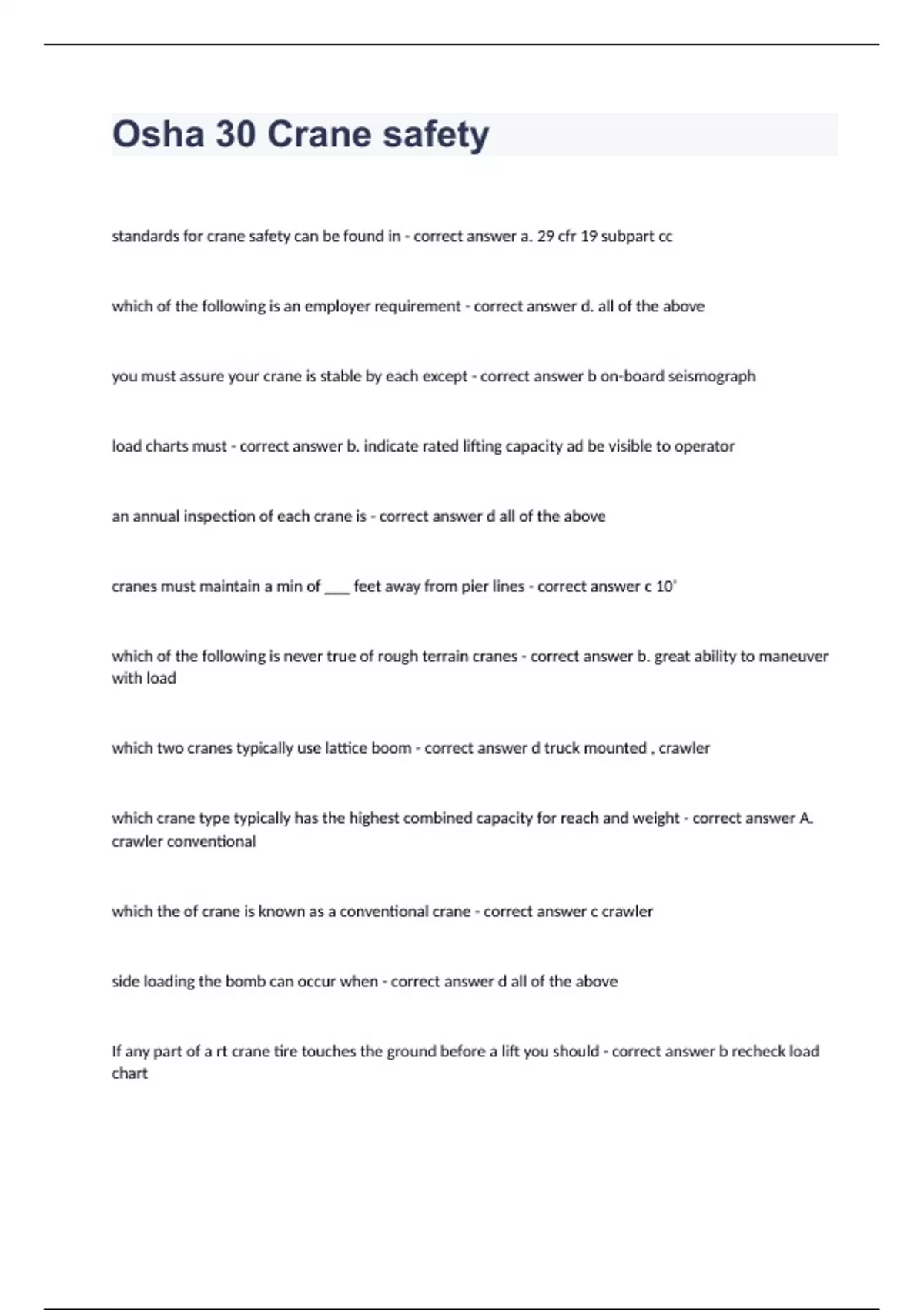 Osha 30 Crane safety Questions with complete solution 2023/2024standards for crane safety can be found in - correct answer a. 29 cfr 19 subpart cc which of the following is an employer requirement - correct answer d. all of the above you must assure your crane is stable by each except - correct answer b on-board seismograph load charts must - correct answer b. indicate rated lifting capacity ad be visible to operator an annual inspection of each crane is - correct answer d all of the above cranes must maintain a min of ___ feet away from pier lines - correct answer c 10' which of the following is never true of rough terrain cranes - correct answer b. great ability to maneuver with load