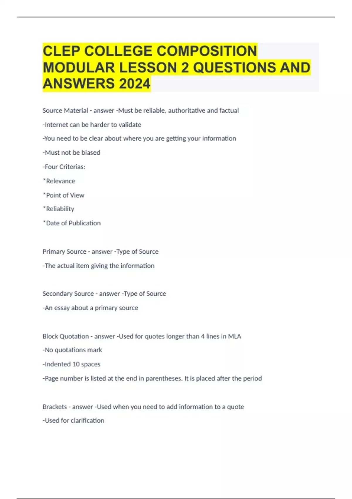 CLEP COLLEGE COMPOSITION MODULAR LESSON 2 QUESTIONS AND ANSWERS 2024