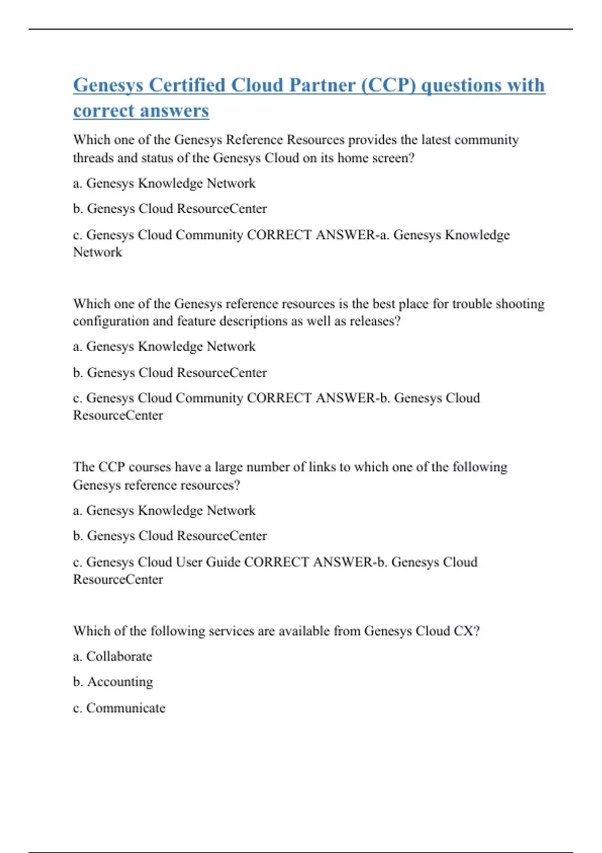 Which one of the Genesys Reference Resources provides the latest community threads and status of the Genesys Cloud on its home screen? a. Genesys Knowledge Network b. Genesys Cloud ResourceCenter c. Genesys Cloud Community CORRECT ANSWER-a. Genesys Knowledge Network Which one of the Genesys reference resources is the best place for trouble shooting configuration and feature descriptions as well as releases? a. Genesys Knowledge Network b. Genesys Cloud ResourceCenter c. Genesys Cloud Community CORRECT ANSWER-b. Genesys Cloud ResourceCenter The CCP courses have a large number of links to which one of the following Genesys reference resources? a. Genesys Knowledge Network b. Genesys Cloud ResourceCenter c. Genesys Cloud User Guide CORRECT ANSWER-b. Genesys Cloud ResourceCenter Which of the following services are available from Genesys Cloud CX? a. Collaborate b. Accounting c. Communicate