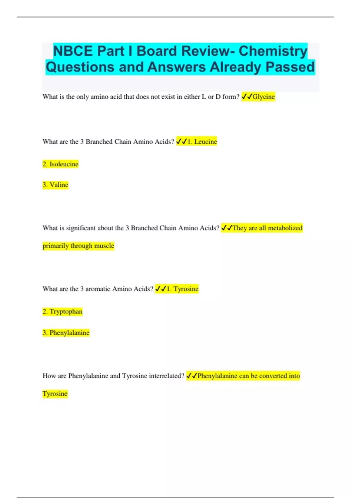 NBCE Part I Board Review- Chemistry Questions and Answers Already Passed What is the only amino acid that does not exist in either L or D form? Glycine What are the 3 Branched Chain Amino Acids? 1. Leucine 2. Isoleucine 3. Valine What is significant about the 3 Branched Chain Amino Acids? They are all metabolized primarily through muscle What are the 3 aromatic Amino Acids? 1. Tyrosine 2. Tryptophan 3. Phenylalanine How are Phenylalanine and Tyrosine interrelated? Phenylalanine can be converted into Tyrosine What is the name of the enzyme that converts Phenylalanine into Tyrosine? Phenylalanine Hydroxylase Which classic metabolic disease is due to a deficiency of the enzyme Phenylalanine Hydroxylase? Phenylketonuria (PKU) What are the 3 Sulfur containing Amino Acids? 1. Cysteine 2. Cystine 3. Methionine What is the term used for when two Cysteines form a covalent bond together to make a Cystine? Di-sulfide Bond What is the first amino acid put into proteins during translation, also known as the "start codon?" Methionine What is Tyrosine a precursor for? -L-Dopamine -Melanin -Norepinephrine -Epinephrine What are considered the catecholamines? -L-Dopamine -Norepinephrine -Epinephrine What is Tryptophan a precursor for? -Serotonin -Niacin Which B Vitamin is Niacin also known as? Vitamin B3 Which co-enzymes are made from Niacin? -NAD+ -NADP+ What is the reduced form of NAD+ and NADP+? NADH and NADPH What is a peptide bond? A covalent chemical bond linking two consecutive amino acid monomers along a peptide or protein chain Which enzyme catalyzes peptide bonds? Peptideal Transferase What are the 4 levels of protein structures? 1. Primary 2. Secondary 3. Tertiary 4. Quaternary What is the primary level of a protein structure? Linear sequence of amino acids What is the secondary level of a protein structure? -Alpha Helix -Beta Pleated Sheet What is a tertiary level of a protein structure? Folding of a single polypeptide- Globular Proteins What is a classic example of a tertiary structured protein? Myoglobin What is quaternary level of a protein structure? Physical association of two or more polypeptide chains What is a classic example of a quaternary structured protein? Hemoglobin which is a tetramer (4 polypeptides) What is the Bohr Effect? A decrease in pH due to an increase in CO2 will promote the release of O2 into tissue by Hemoglobin to decrease CO2 levels. What does catalyzing mean? To increase the rate of a reaction How do enzymes increase the rate of a reaction? By decreasing the active energy What does ΔG mean? The change in energy What does -ΔG mean? The product is low in energy and is an exothermic, spontaneous, favorable reaction.. What
