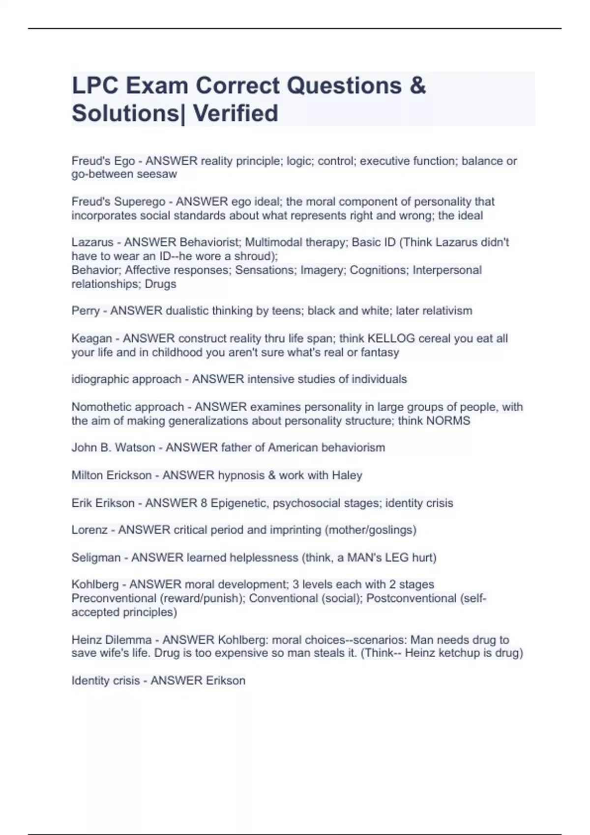 Freud's Ego - ANSWER reality principle; logic; control; executive function; balance or go-between seesaw Freud's Superego - ANSWER ego ideal; the moral component of personality that incorporates social standards about what represents right and wrong; the ideal Lazarus - ANSWER Behaviorist; Multimodal therapy; Basic ID (Think Lazarus didn't have to wear an ID--he wore a shroud); Behavior; Affective responses; Sensations; Imagery; Cognitions; Interpersonal relationships; Drugs Perry - ANSWER dualistic thinking by teens; black and white; later relativism Keagan - ANSWER construct reality thru life span; think KELLOG cereal you eat all your life and in childhood you aren't sure what's real or fantasy idiographic approach - ANSWER intensive studies of individuals Nomothetic approach - ANSWER examines personality in large groups of people, with the aim of making generalizations about personality structure; think NORMS John B. Watson - ANSWER father of American behaviorism Milton Erickson - ANSWER hypnosis & work with Haley Erik Erikson - ANSWER 8 Epigenetic, psychosocial stages; identity crisis Lorenz - ANSWER critical period and imprinting (mother/goslings) Seligman - ANSWER learned helplessness (think, a MAN's LEG hurt) Kohlberg - ANSWER moral development; 3 levels each with 2 stages Preconventional (reward/punish); Conventional (social); Postconventional (self-accepted principles) Heinz Dilemma - ANSWER Kohlberg: moral choices--scenarios: Man needs drug to save wife's life. Drug is too expensive so man steals it. (Think-- Heinz ketchup is drug) Identity crisis - ANSWER Erikson Harry Stack Sullivan - ANSWER Psychiatry of Interpersonal Relations