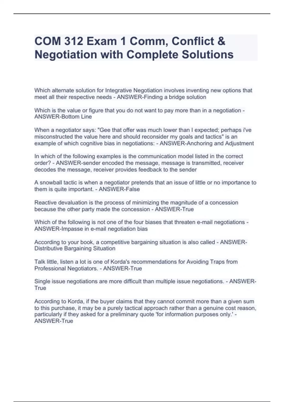 COM 312 Exam 1 Comm, Conflict & Negotiation with Complete Solutions COM 312 Exam 1 Comm, Conflict & Negotiation with Complete Solutions COM 312 Exam 1 Comm, Conflict & Negotiation with Complete Solutions COM 312 Exam 1 Comm, Conflict & Negotiation with Complete SolutionsWhich alternate solution for Integrative Negotiation involves inventing new options that meet all their respective needs - ANSWER-Finding a bridge solution Which is the value or figure that you do not want to pay more than in a negotiation - ANSWER-Bottom Line When a negotiator says: "Gee that offer was much lower than I expected; perhaps i've misconstructed the value here and should reconsider my goals and tactics" is an example of which cognitive bias in negotiations: - ANSWER-Anchoring and Adjustment In which of the following examples is the communication model listed in the correct order? - ANSWER-sender encoded the message, message is transmitted, receiver