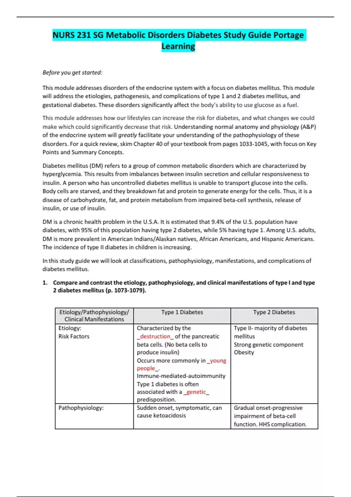 NURS 231 SG Metabolic Disorders Diabetes Study Guide Portage Learning