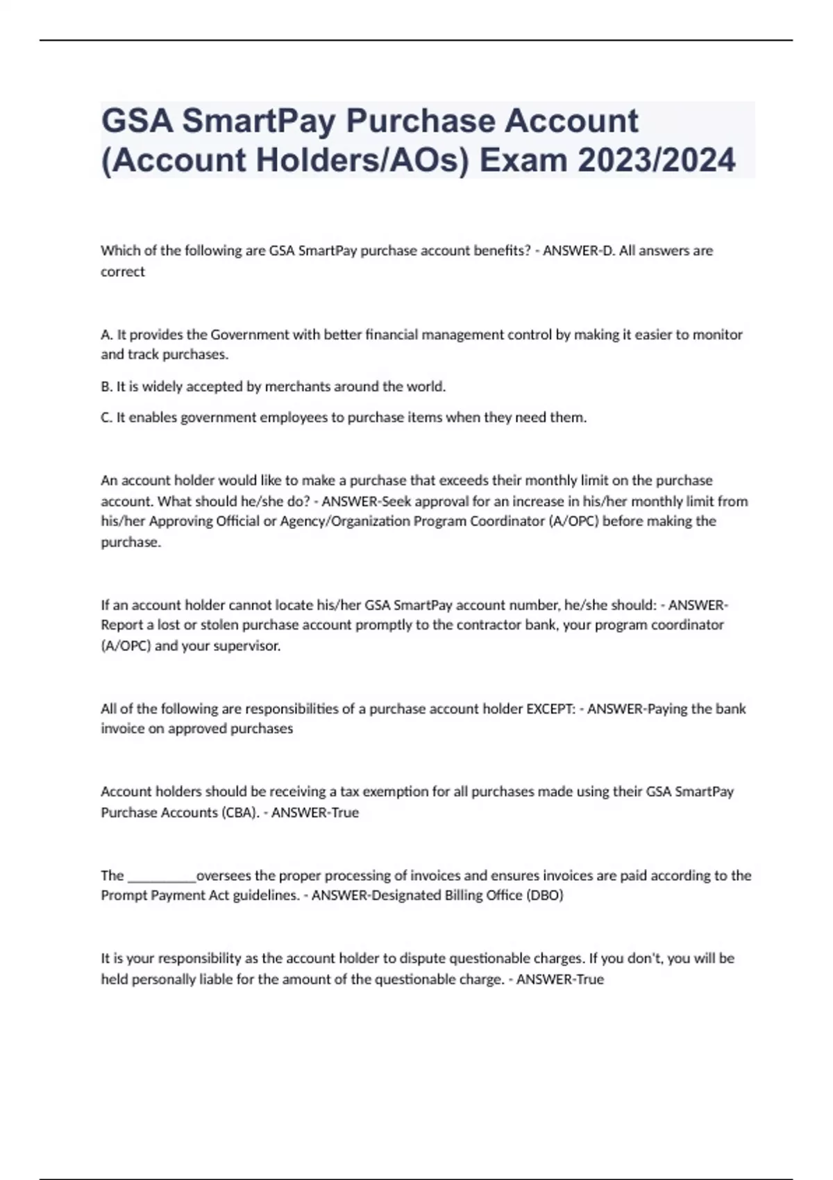 GSA SmartPay Purchase Account (Account Holders/AOs) Exam 2023/2024 Which of the following are GSA SmartPay purchase account benefits? - ANSWER-D. All answers are correct A. It provides the Government with better financial management control by making it easier to monitor and track purchases. B. It is widely accepted by merchants around the world. C. It enables government employees to purchase items when they need them. An account holder would like to make a purchase that exceeds their monthly limit on the purchase account. What should he/she do? - ANSWER-Seek approval for an increase in his/her monthly limit from his/her Approving Official or Agency/Organization Program Coordinator (A/OPC) before making the purchase. If an account holder cannot locate his/her GSA SmartPay account number, he/she should: - ANSWER-Report a lost or stolen purchase account promptly to the contractor bank, your program coordinator (A/OPC) and your supervisor. All of the following are responsibilities of a purchase account holder EXCEPT: - ANSWER-Paying the bank invoice on approved purchases Account holders should be receiving a tax exemption for all purchases made using their GSA SmartPay Purchase Accounts (CBA). - ANSWER-True The _________oversees the proper processing of invoices and ensures invoices are paid according to the Prompt Payment Act guidelines. - ANSWER-Designated Billing Office (DBO) It is your responsibility as the account holder to dispute questionable charges. If you don't, you will be held personally liable for the amount of the questionable charge. - ANSWER-True
