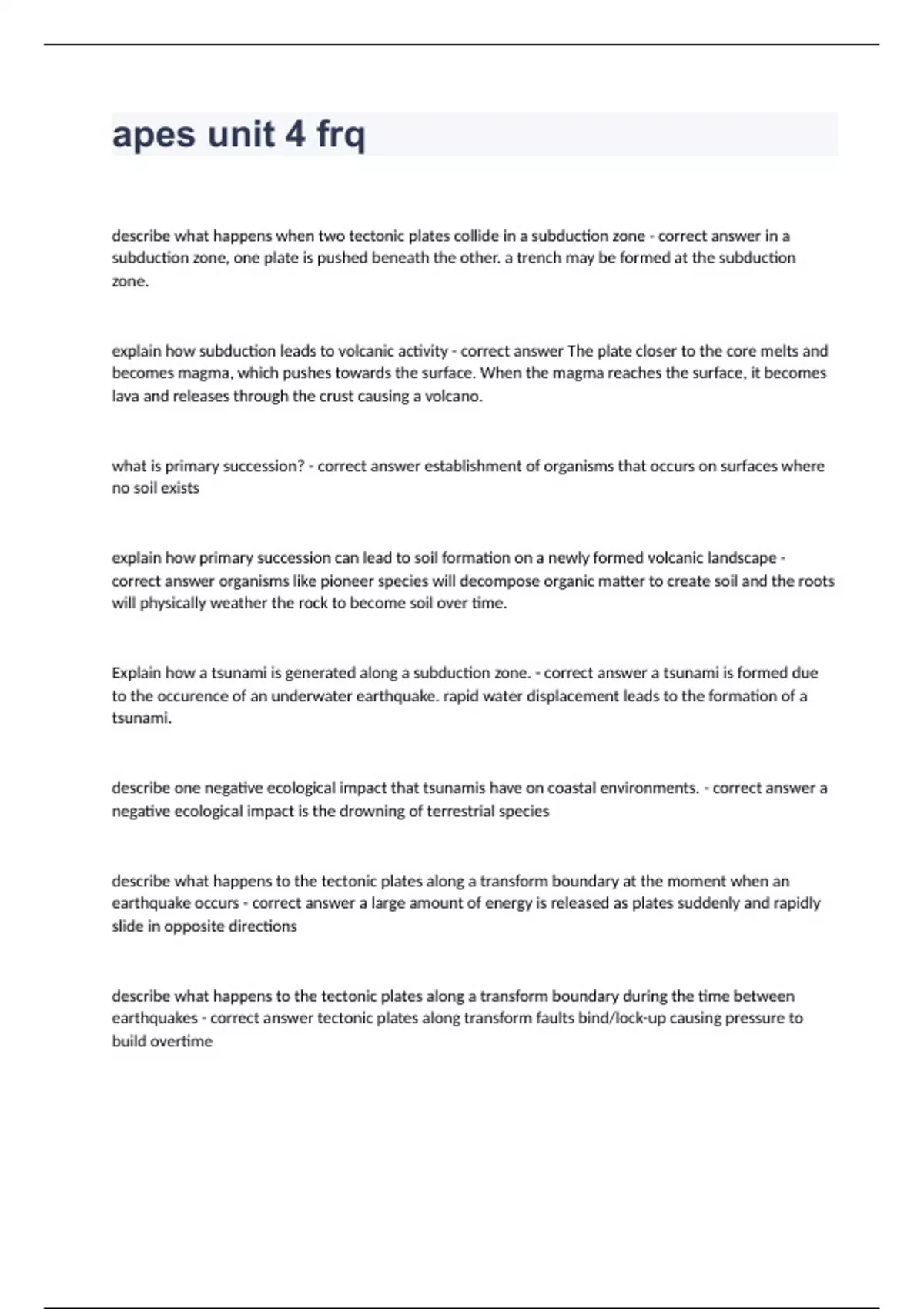 apes unit 4 frq Question and answers correctly solved 2023/2024 describe what happens when two tectonic plates collide in a subduction zone - correct answer in a subduction zone, one plate is pushed beneath the other. a trench may be formed at the subduction zone. explain how subduction leads to volcanic activity - correct answer The plate closer to the core melts and becomes magma, which pushes towards the surface. When the magma reaches the surface, it becomes lava and releases through the crust causing a volcano. what is primary succession? - correct answer establishment of organisms that occurs on surfaces where no soil exists explain how primary succession can lead to soil formation on a newly formed volcanic landscape - correct answer or