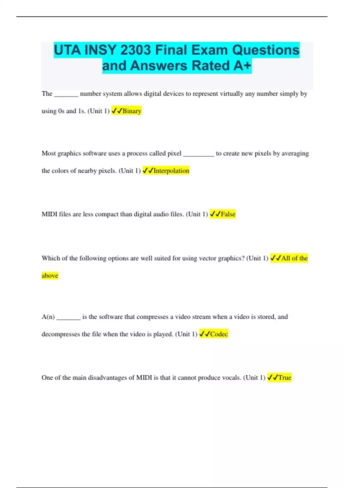 UTA INSY 2303 Final Exam Questions and Answers Rated A+ The _______ number system allows digital devices to represent virtually any number simply by using 0s and 1s. (Unit 1) Binary Most graphics software uses a process called pixel _________ to create new pixels by averaging the colors of nearby pixels. (Unit 1) Interpolation MIDI files are less compact than digital audio files. (Unit 1) False Which of the following options are well suited for using vector graphics? (Unit 1) All of the above A(n) _______ is the software that compresses a video stream when a video is stored, and decompresses the file when the video is played. (Unit 1) Codec One of the main disadvantages of MIDI is that it cannot produce vocals. (Unit 1) True Most music for portable media players is stored in _______ audio file formats. (Unit 1) Compressed Which of the following is NOT a type of bitmap format? (Unit 1) ZIP Instead of storing the color value for each pixel, a vector graphics file contains instructions that a computer uses to create the shape, size, position, and color for each object in an image. (Unit 1) True __________ is music, speech, and other sounds represented in binary format for use in digital devices. (Unit 1) Digital audio In the context of bitmap graphics editing, what technique employs algorithms that pull pixels from one area of an image and then apply them to another area? (Unit 1) Cloning Digital data can be __________ that have been converted into discrete digits such as 0s and 1s. (Unit 1) All of the above 8-bit color depth is also called True Color. (Unit 1) False Both scanners and digital cameras produce vector graphics. (Unit 1) False Lossy compression techniques discard some data from an image to shrink its file size. (Unit 1) True In digital video, a lower resolution reduces the bit rate. (Unit 1) True TIFF, PNG, and GIF graphics formats offer lossy compression. (Unit 1) False A bitmap graphic is composed of a grid of tiny rectangular cells. (Unit 1) True Lossy compression throws away some of the original data during the compression process. (Unit 1) True _________ enables people to control software with spoken commands, as well as dictate text into a word processing document. (Unit 1) Speech recognition To conserve space, applications that require high-quality sound use low sampling rates. (Unit 1) False Which of the following is NOT a format that is used for digital audio? (Unit 1) DOC Digital photographs are stored as bitmap files. (Unit 1) True Digital video is a core technology for which of the following? (Unit 1) All of the above Which