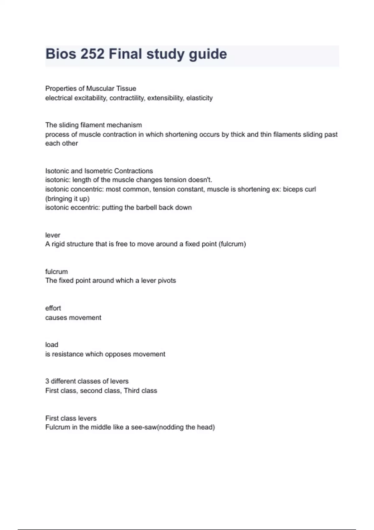 isotonic concentric: most common, tension constant, muscle is shortening ex: biceps curl