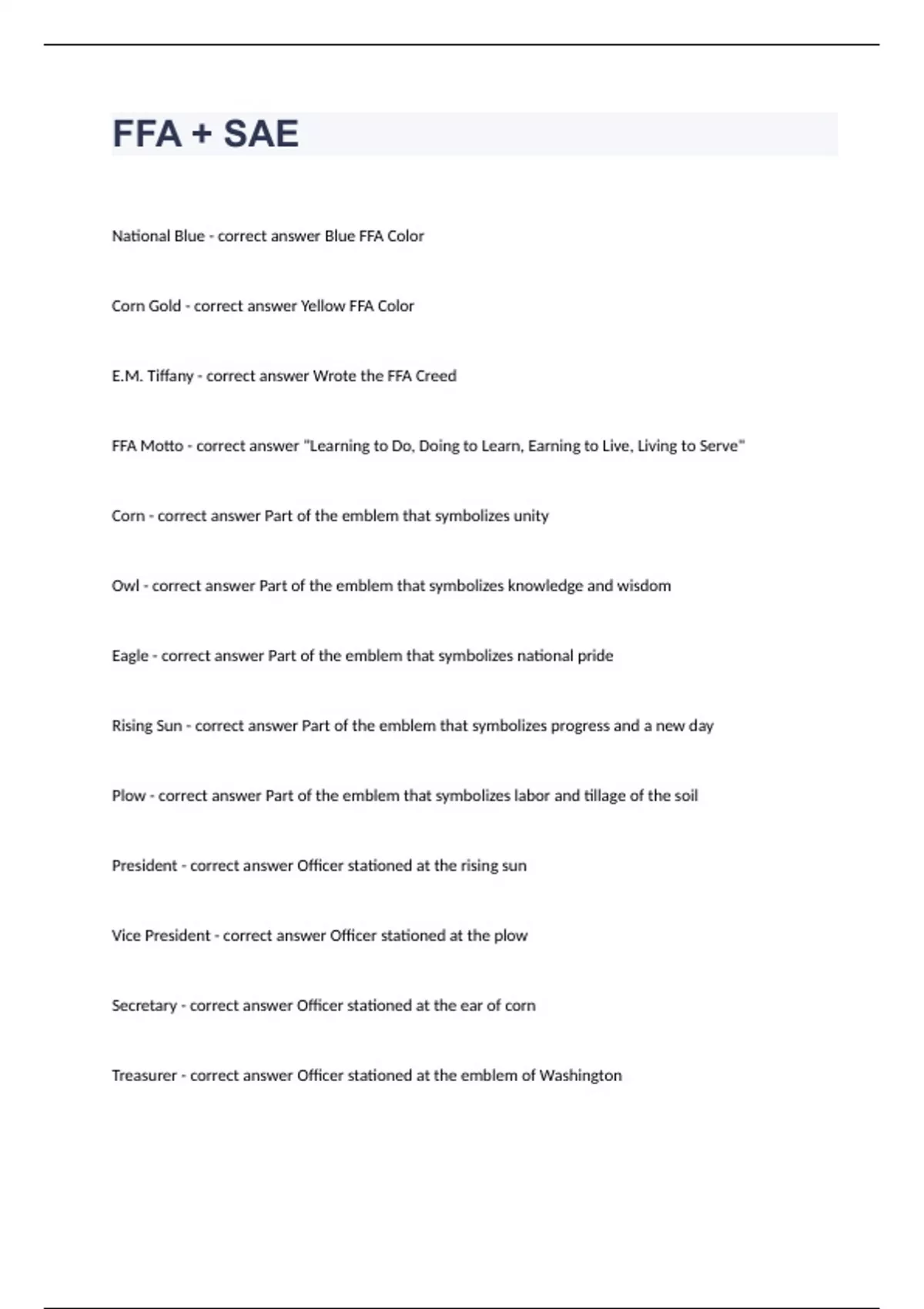 FFA + SAE Questions with complete solution 2023/2024National Blue - correct answer Blue FFA Color Corn Gold - correct answer Yellow FFA Color E.M. Tiffany - correct answer Wrote the FFA Creed FFA Motto - correct answer "Learning to Do, Doing to Learn, Earning to Live, Living to Serve" Corn - correct answ