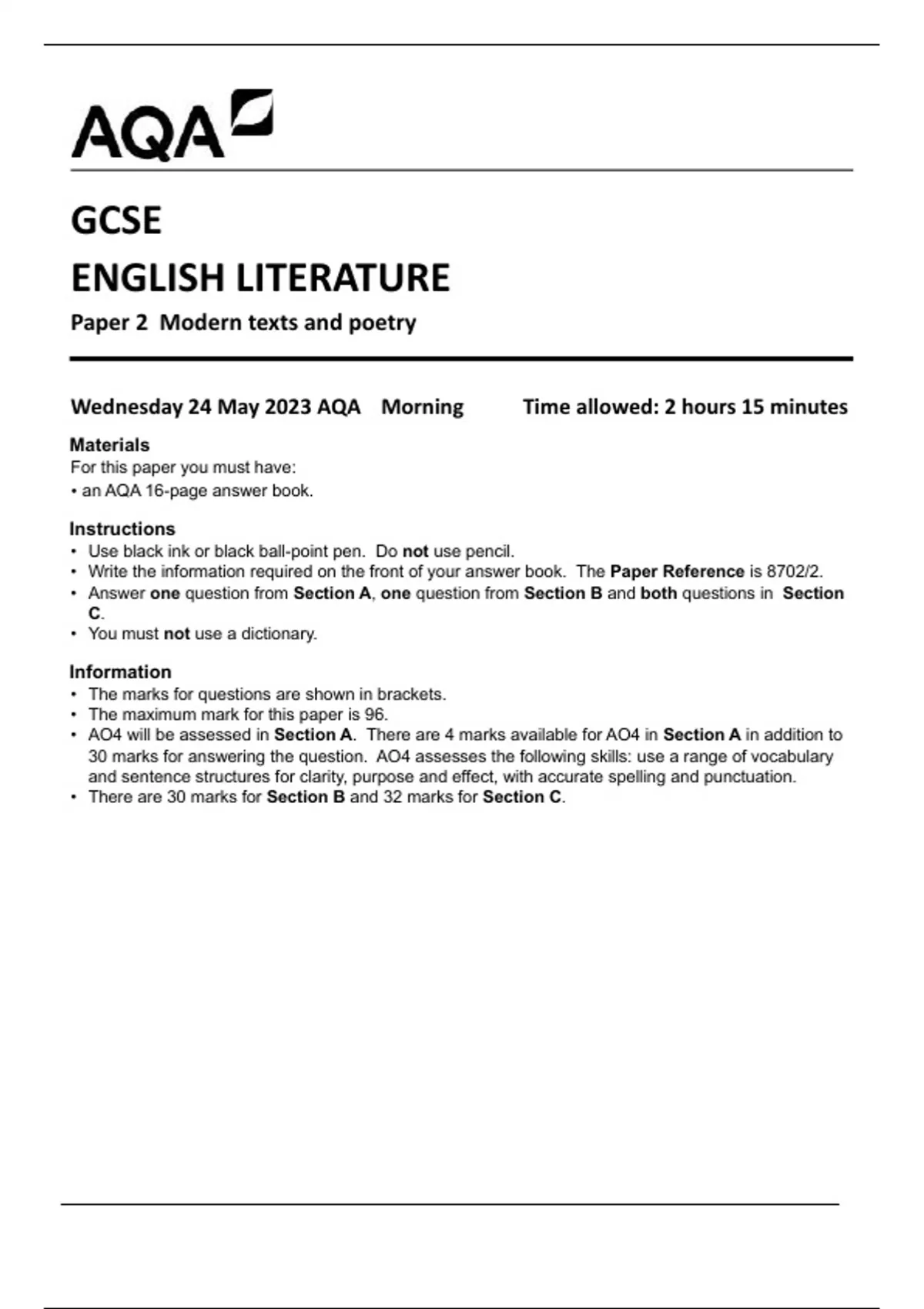 AQA GCSE ENGLISH LITERATURE Paper 2 Modern texts and poetry Wednesday 24 May 2023