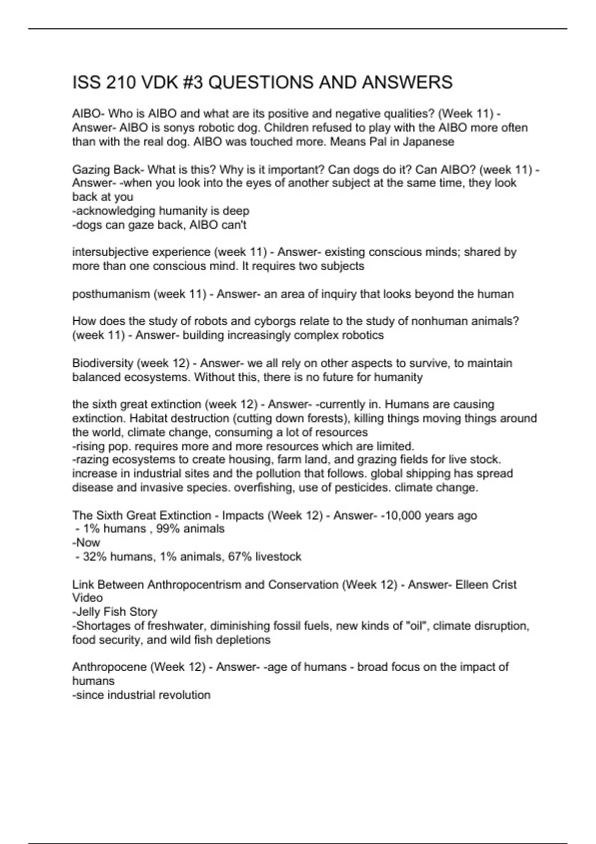 AIBO- Who is AIBO and what are its positive and negative qualities? (Week 11) - Answer- AIBO is sonys robotic dog. Children refused to play with the AIBO more often than with the real dog. AIBO was touched more. Means Pal in Japanese Gazing Back- What is this? Why is it important? Can dogs do it? Can AIBO? (week 11) - Answer- -when you look into the eyes of another subject at the same time, they look back at you -acknowledging humanity is deep -dogs can gaze back, AIBO can't intersubjective experience (week 11) - Answer- existing conscious minds; shared by more than one conscious mind. It requires two subjects posthumanism (week 11) - Answer- an area of inquiry that looks beyond the human How does the study of robots and cyborgs relate to the study of nonhuman animals? (week 11) - Answer- building increasingly complex robotics Biodiversity (week 12) - Answer- we all rely on other aspects to survive, to maintain balanced ecosystems. Without this, there is no future for humanity the sixth great extinction (week 12) - Answer- -currently in. Humans are causing extinction. Habitat destruction (cutting down forests), killing things moving things around the world, climate change, consuming a lot of resources -rising pop. requires more and more resources which are limited. -razing ecosystems to create housing, farm land, and grazing fields for live stock. increase in industrial sites and the pollution that follows. global shipping has spread disease and invasive species. overfishing, use of pesticides. climate change. The Sixth Great Extinction - Impacts (Week 12) - Answer- -10,000 years ago - 1% humans , 99% animals -Now - 32% humans, 1% animals, 67% livestock Link Between Anthropocentrism and Conservation (Week 12) - Answer- Elleen Crist Video -Jelly Fish Story -Shortages of freshwater, diminishing fossil fuels, new kinds of "oil", climate disruption, food security, and wild fish depletions Anthropocene (Week 12) - Answer- -age of humans - broad focus on the impact of