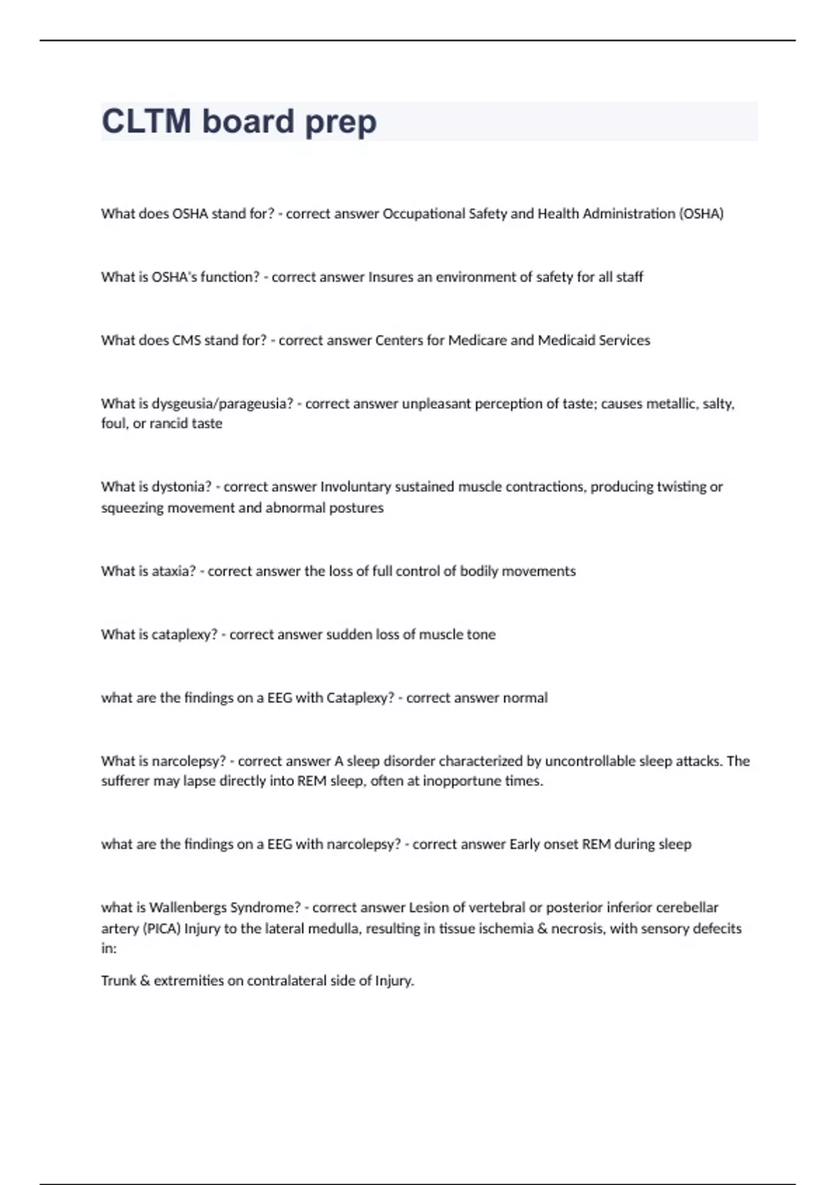 CLTM board prepWhat does OSHA stand for? - correct answer Occupational Safety and Health Administration (OSHA) What is OSHA's function? - correct answer Insures an environment of safety for all staff What does CMS stand for? - correct answer Centers for Medicare and Medicaid Services What is dysgeusia/parageusia? - correct answer unpleasant perception of taste; causes metallic, salty, foul, or rancid taste What is dystonia? - correct answer Involuntary sustained muscle contractions, producing twisting or squeezing movement and abnormal postures What is ataxia? - correct answer the loss of full control of bodily movements What is cataplexy? - correct answer sudden loss of muscle tone what are the findings on a EEG with Cataplexy? - correct answer normal What is narcolepsy? - correct answer A sleep disorder characterized by uncontrollable sleep attacks. The sufferer may lapse directly into REM sleep, often at inopportune times. what are the findings on a EEG with narcolepsy? - correct answer Early onset REM during sleep what is Wallenbergs Syndrome? - correct answer Lesion of vertebral or posterior inferior cerebellar artery (PICA) Injury to the lateral medulla, resulting in tissue ischemia & necrosis, with sensory defecits in: Trunk & extremities on contralateral side of Injury. Face & cranial nerves on the ipsilateral side of the injury. What is dysphagia? - correct answer difficulty swallowing What is vertigo? - correct answer dizziness What is nystagmus? - correct answer involuntary eye movement What is dysarthria? - correct answer Neurological based speech disorder characterized by abnormal strength, speed, range, steadiness, tone and accuracy. Affects all aspects of speech production, including respiration, phonation, articulation, prosody and resonance. what is ptosis? - correct answer drooping eyelid what is Horners Syndrome? - correct answer unilateral combination of: drooping eyelid (ptosis) constricted pupil (miosis) decreased sweating (anhidrosis) eye redness what is Cortical Dysplasia? - correct answer Intractable Seizures
