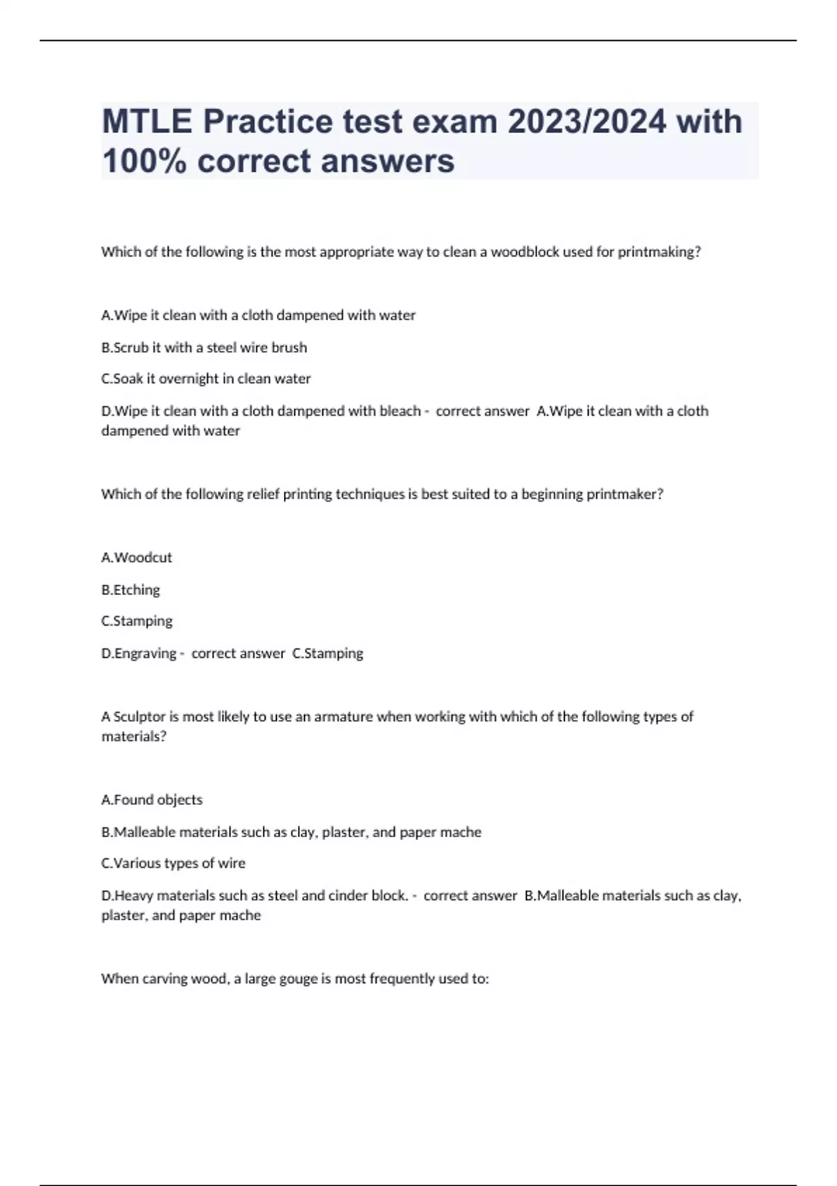 Which of the following is the most appropriate way to clean a woodblock used for printmaking? A.Wipe it clean with a cloth dampened with water B.Scrub it with a steel wire brush C.Soak it overnight in clean water D.Wipe it clean with a cloth dampened with bleach - correct answer A.Wipe it clean with a cloth dampened with water Which of the following relief printing techniques is best suited to a beginning printmaker? A.Woodcut B.Etching C.Stamping D.Engraving - correct answer C.Stamping A Sculptor is most likely to use an armature when working with which of the following types of materials? A.Found objects B.Malleable materials such as clay, plaster, and paper mache C.Various types of wire D.Heavy materials such as steel and cinder block. - correct answer B.Malleable materials such as clay, plaster, and paper mache When car