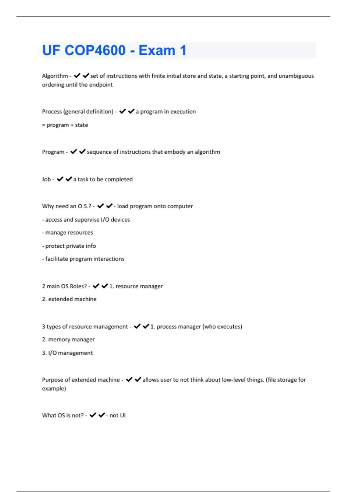 Algorithm - set of instructions with finite initial store and state, a starting point, and unambiguous ordering until the endpoint Process (general definition) - a program in execution = program + state Program - sequence of instructions that embody an algorithm Job - a task to be completed Why need an O.S.? - - load program onto computer - access and supervise I/O devices - manage resources - protect private info - facilitate program interactions 2 main OS Roles? - 1. resource manager 2. extended machine 3 types of resource management - 1. process manager (who executes) 2. memory manager 3. I/O management Purpose of extended machine - allows user to not think about low-level things. (file storage for example) What OS is not? - - not UI- not development tools - not libraries (even if it may use them) 3 general OS types - - interactive (laptop/pc) - batch (priority is pre-defined queued tasks) - real time (well-defined task priorities like in avionics or cars) 5 generations of OS - '45-'55 : vacuum tubes / plugboards '55-'65 : transistors/batch '65-'80 : ICs and timesharing '80-now : PCs '90-now : mobile computers and multicore systems Multiprogramming v. Uniprogramming - multiple = 2+ programs' data concurrently in main memory (RAM) (uni is just 1 at a time) T/F: modern systems do not allow direct reads from the disk, rather a syscall is passed to the kernel which then returns the info (if allowed) - True 2 types of named calls - 1. procedure calls 2. system calls Procedure Calls - - essentially a function call - no context switch to kernel space (faster bc no OS help necessary) - local vars and parameters - frame pointer (where stack was before call) - stack pointer (where new bottom of stack is)Segments of Process in Memory - - TEXT(lowest): code being executed - DATA(middle growing up): static + dynamic - STACK(highest growing down): activation frames of calls System Calls - - provide interface to OS services - context switch to kernel mode - has sys lib entry point - invocation causes kernel trap - sys call number identifies a sysfunc from table - returns to library, returns to user program - parameters stored at specific mem. locations