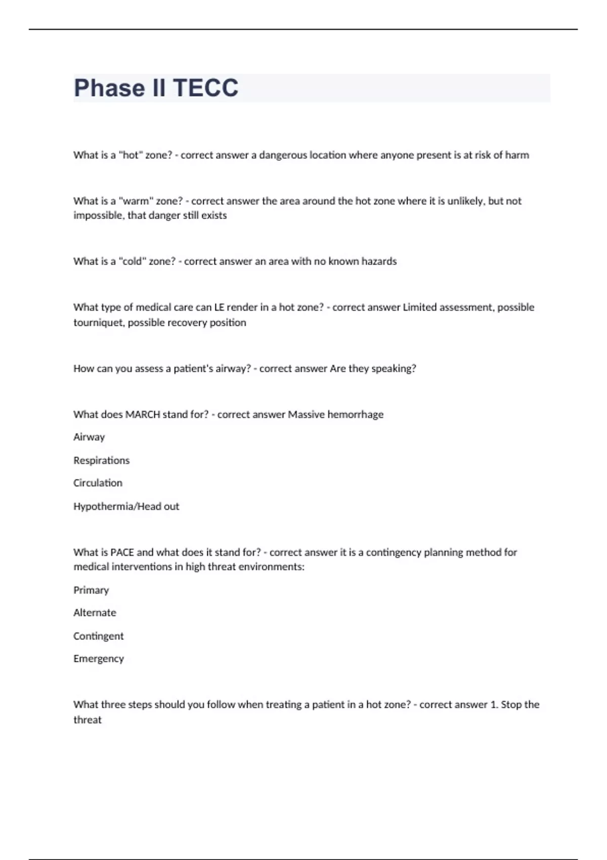 Phase II TECCWhat is a "hot" zone? - correct answer a dangerous location where anyone present is at risk of harm What is a "warm" zone? - correct answer the area around the hot zone where it is unlikely, but not impossible, that danger still exists What is a "cold" zone? - correct answer an area with no known hazards What type of medical care can LE render in a hot zone? - correct answer Limited assessment, possible tourniquet, possible recovery position How can you assess a patient's airway? - correct answer Are they speaking? What does MARCH stand for? - correct answer Massive hemorrhage Airway Respirations Circulation Hypothermia/Head out What is PACE and what does it stand for? - correct answer it is a contingency planning method for medical interventions in high threat environments: Primary Alternate Contingent Emergency What three steps should you follow when treating a patient in a hot zone? - correct answer 1. Stop the threat
