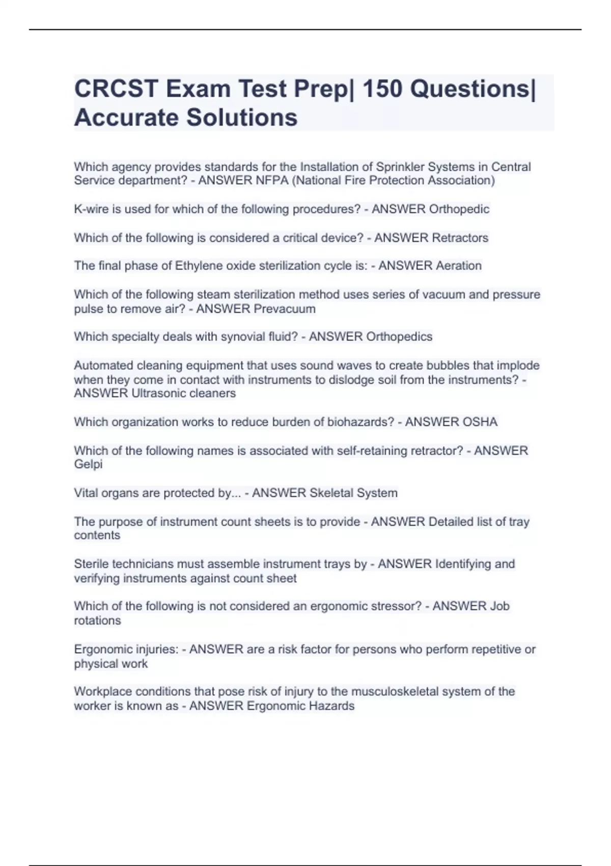Which agency provides standards for the Installation of Sprinkler Systems in Central Service department? - ANSWER NFPA (National Fire Protection Association) K-wire is used for which of the following procedures? - ANSWER Orthopedic Which of the following is considered a critical device? - ANSWER Retractors The final phase of Ethylene oxide sterilization cycle is: - ANSWER Aeration Which of the following steam sterilization method uses series of vacuum and pressure pulse to remove air? - ANSWER Prevacuum Which specialty deals with synovial fluid? - ANSWER Orthopedics Automated cleaning equipment that uses sound waves to create bubbles that implode when they come in contact with instruments to dislodge soil from the instruments? - ANSWER Ultrasonic cleaners Which organization works to reduce burden of biohazards? - ANSWER OSHA Which of the following names is associated with self-retaining retractor? - ANSWER Gelpi Vital organs are protected by... - ANSWER Skeletal System The purpose of instrument count sheets is to provide - ANSWER Detailed list of tray contents Sterile technicians must assemble instrument trays by - ANSWER Identifying and verifying instruments against count sheet Which of the following is not considered an ergonomic stressor? - ANSWER Job rotations Ergonomic injuries: - ANSWER are a risk factor for persons who perform repetitive or physical work Workplace conditions that pose risk of injury to the musculoskeletal system of the worker is known as - ANSWER Ergonomic Hazards