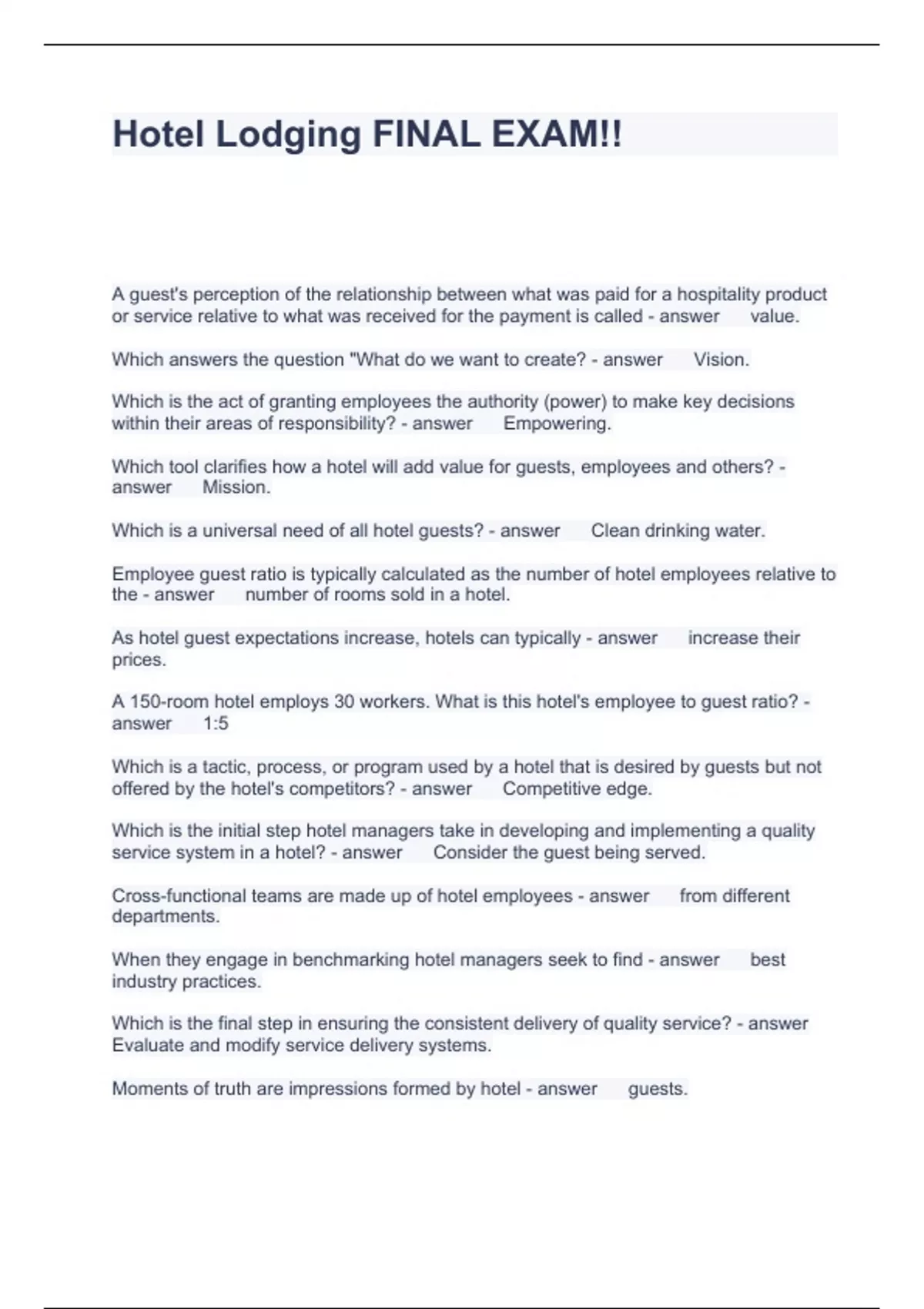 Hotel Lodging FINAL EXAM Questions and Answers Graded A+