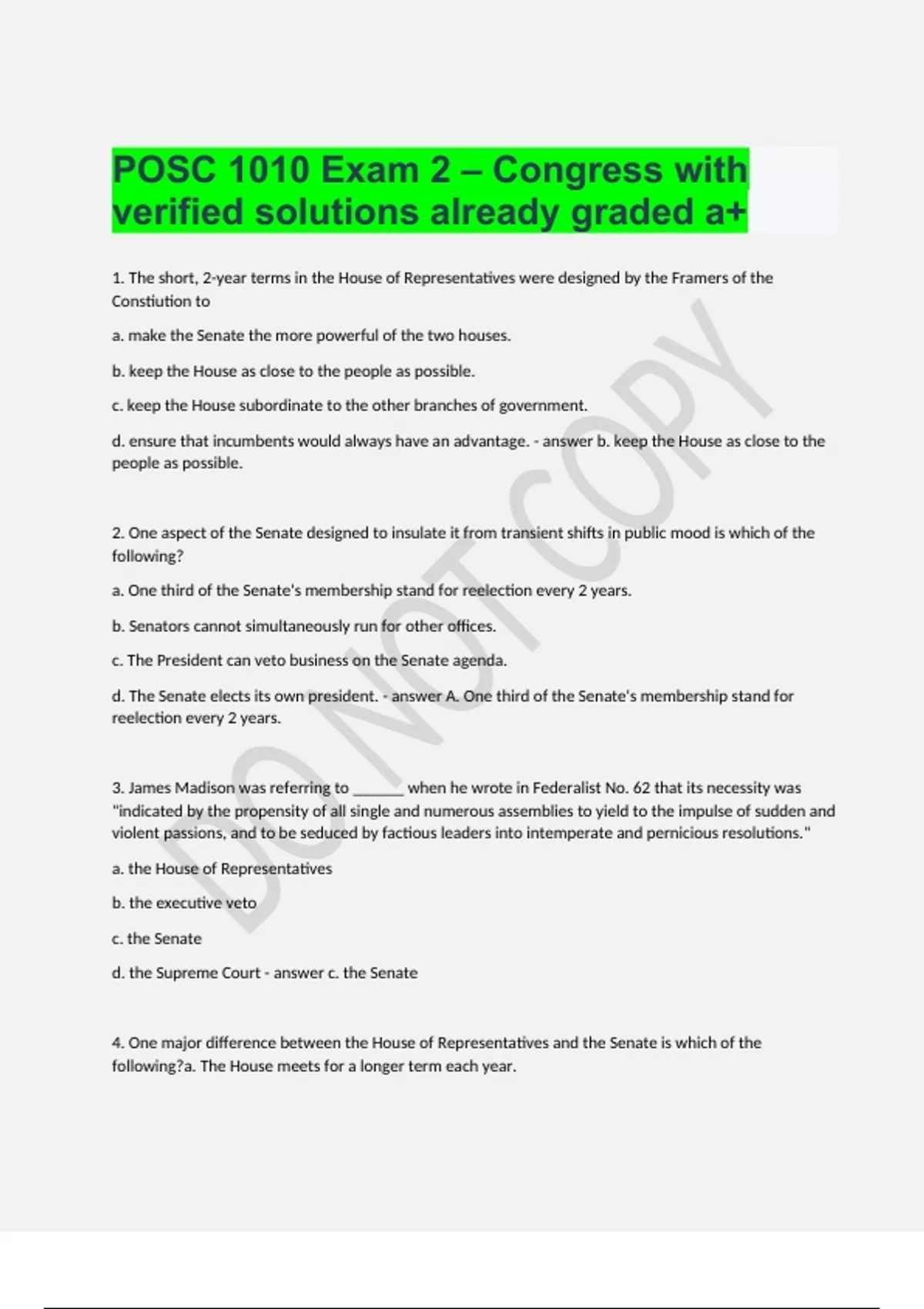 POSC 1010 Exam 2 – Congress with verified solutions already graded a+