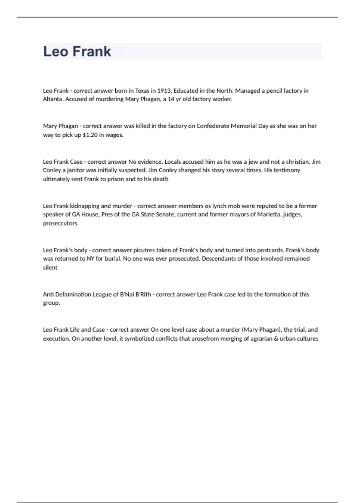 Leo Frank Questions with complete solution 2023/2024 Leo Frank - correct answer born in Texas in 1913. Educated in the North. Managed a pencil factory in Altanta. Accused of murdering Mary Phagan, a 14 yr old factory worker. Mary Phagan - correct answer was killed in the factory on Confederate Memorial Day as she was on her way to pick up $1.20 in wages. Leo Frank Case - correct answer No evidence. Locals accused him as he was a jew and not a christian. Jim Conley a janitor was initially suspected. Jim Conley changed his story several times. His testimony ultimately sent Fra