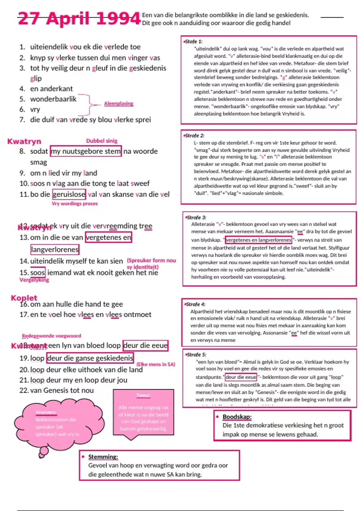 Summary - Afrikaans Huistaal- 27 April 1994 Gedig 1