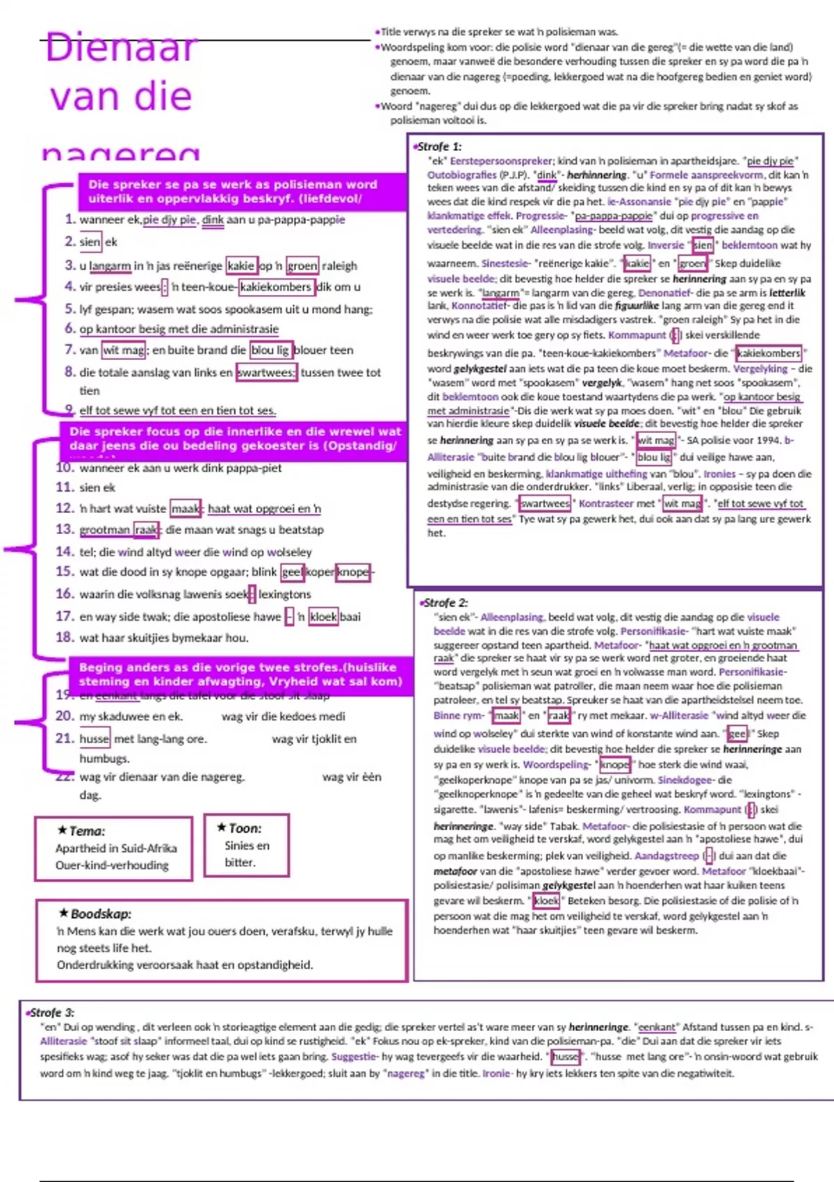 Alliterasie “stoof sit slaap” informeel taal, dui op kind se rustigheid. “ek” Fokus nou op ek-spreker, kind van die polisieman-pa. “die” Dui aan dat die spreker vir iets