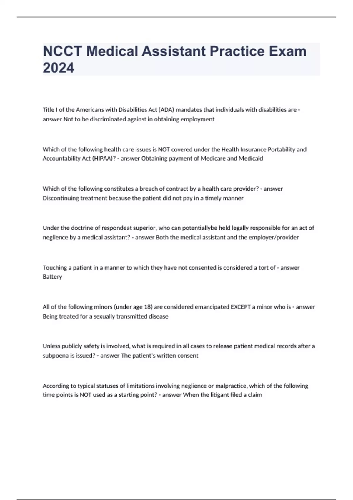 NCCT Medical Assistant Practice Exam with Answers 2024. Which of the following constitutes a breach of contract by a health care provider? Discontinuing treatment because the patient did not pay in a timely manner Under the doctrine of respondeat superior, who can potentiallybe held legally responsible for an act of neglience by a medical assistant? Both the medical assistant and the employer/provider Touching a patient in a manner to which they have not consented is considered a tort of Battery All of the following minors (under age 18) are considered emancipated EXCEPT a minor who is Being treated for a sexually transmitted disease
