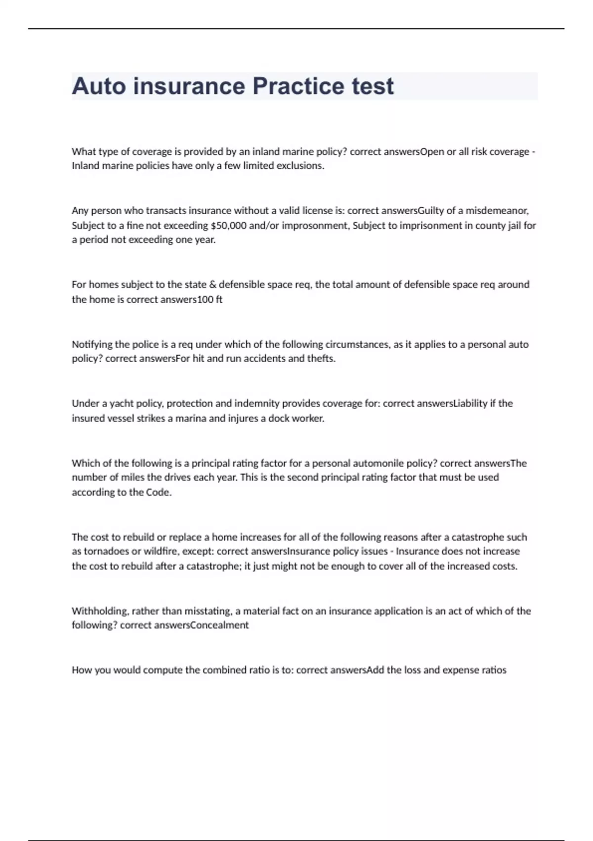auto insurance practice test