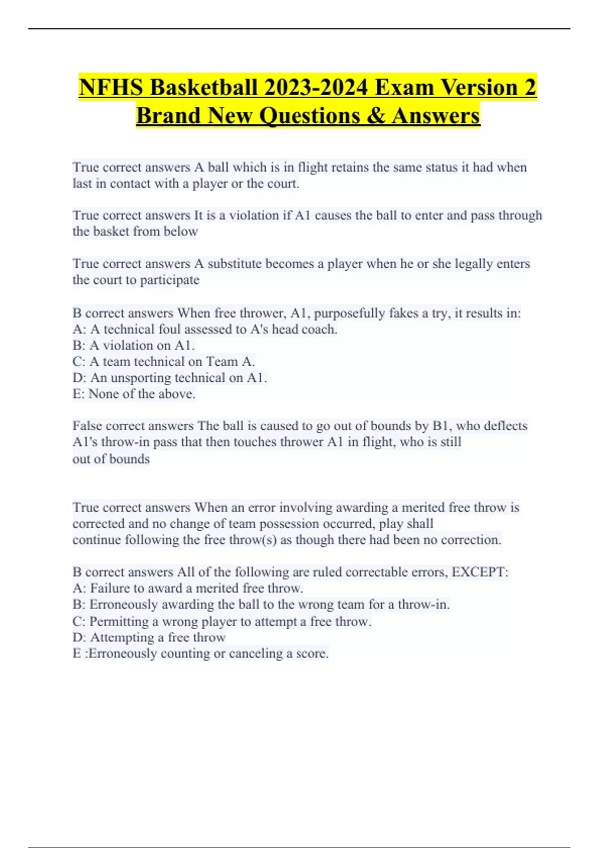 NFHS Basketball Exam Version 2 Brand New Questions & Answers