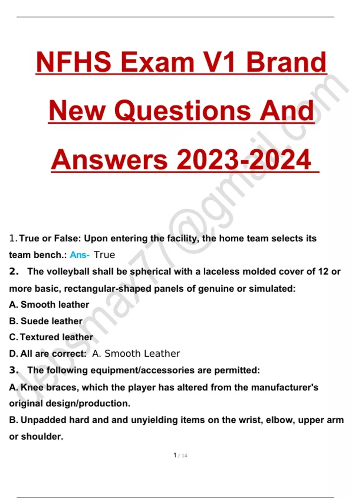 NFHS Basketball Exam Version 2 Brand New Questions & Answers 1. True or False: Upon entering the facility, the home team selects its team bench.: Ans- True 2. The volleyball shall be spherical with a laceless molded cover of 12 or more basic, rectangular-shaped panels of genuine or simulated: A. Smooth leather B. Suede leather C. Textured leather D. All are correct: A. Smooth Leather 3. The following equipment/accessories are permitted: A. Knee braces, which the player has altered from the manufacturer's original design/production. B. Unpadded hard and and unyielding items on the wrist, elbow, upper arm or shoulder. C. Hair devices made of soft material and no more than 3 inches wide. D. All are correct.: C. Hair devices made of soft material and no more than 3 inches wide. 4. True or False: The Libero and/or his/her teammates shall wear a solid-col- ored uniform top. If both uniform tops are solid, they must be contrasting colors.: True 5. Prematch duties for the first referee shall include: A. Assign line judges to their positions. B. Call a captain(s) and the head coach from each team together for a prematch conference by sounding a double whistle and raising a coin in the air. C. Establish non playable areas and define any additional ground rules which may be necessary. D. All are correct.: D. All are correct. 6. True or False: The written lineup shall not be changed except between sets of a math (no later than one minute remaining in the timed interval or intermission when used), for a legal substitution prior to the start of the set, or to replace a starting player who is injured/ill prior to the start of the set.: True 7. After the first referee's signal to serve, a re-serve occurs when the server: A. Drops the ball and then serves it as it bounces off the floor. B. Allows the tossed ball to drop to the ground without it being touched. C. Swings, misses and the ball contacts his/her shoulder. D. Tosses the ball and it contacts a backboard or it's supports hanging in a vertical position over the service area.: B. Allows the tossed ball to drop to the ground without it being touched. 8. True or False: The first referee may utilize a team's video recording device to review a decision when requested to do so by the head coach.: False 9. True or False: A back-row player (on or in front of the attack line) may contact the ball completely above the height of the net and complete an attack.: False 10. It is a net fault when: A. A player's loose uniform touches the net. B. A player contacts the net when he/she is not involved in the play. C. A player contacts the antenna after attacking the ball but before the ball is played or becomes dead. D. All are net faults: D. All are net faults