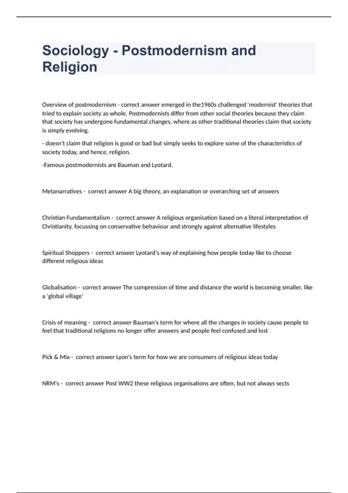 Sociology - Postmodernism and Religion Questions with complete solution 2023/2024 Overview of postmodernism - correct answer emerged in the1960s challenged 'modernist' theories that tried to explain society as whole. Postmodernists differ from other social theories because they claim that society has undergone fundamental changes, where as other traditional theories claim that society is simply evolving. - doesn't claim that religion is good or bad but simply seeks to explore some of the characteristics of society today, and hence, religion. -Famous postmodernists are Bauman and Lyotard. Metanarratives - correct answer A big theory, an explanation or overarching set of answers Christian Fundamentalism - correct answer A religious organisation based on a literal interpretation of Christianity, focussing on conservative behaviour and strongly against alternative lifestyles Spiritual Shoppers - correct answer Lyotard's way of explaining how people today like to choose different religious ideas Globalisation - correct answer The compression of time and distance the world is becoming smaller, like a 'global village'