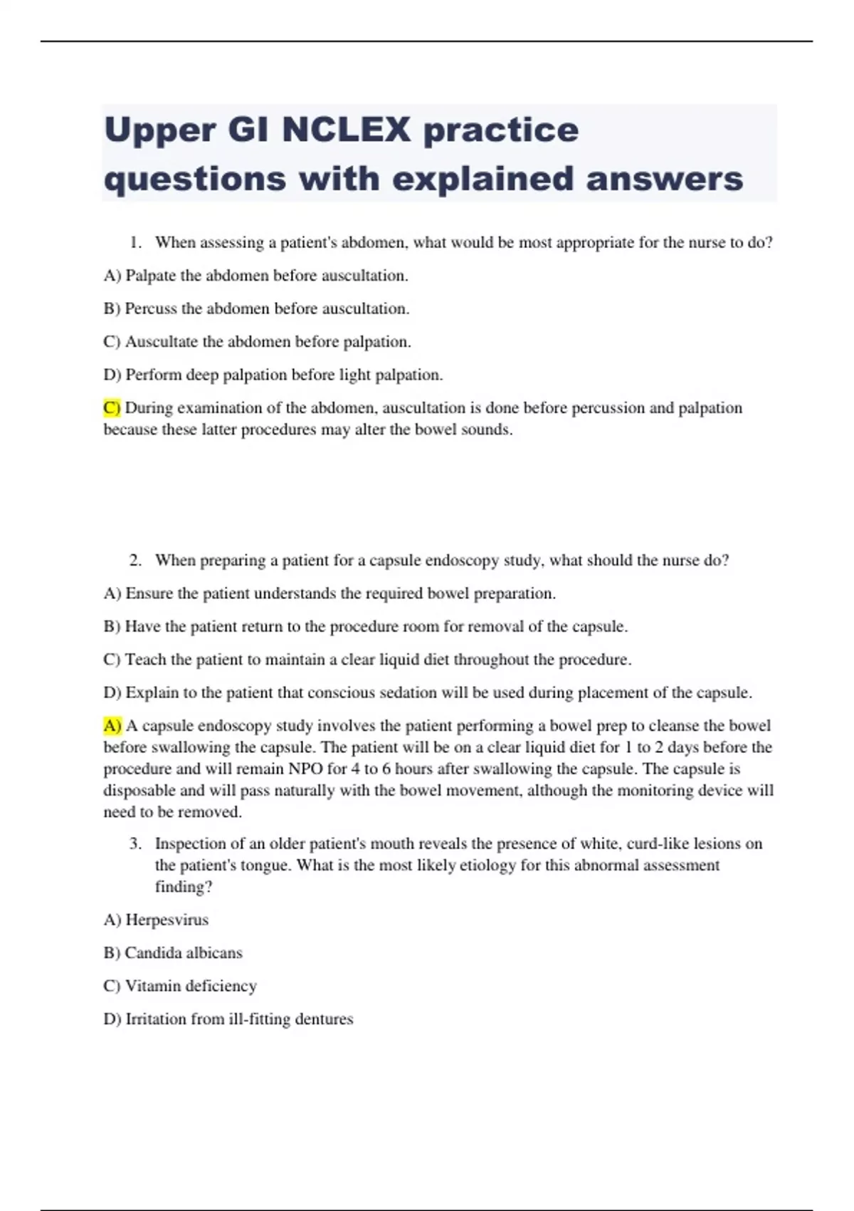 Upper GI NCLEX practice questions with explained answers When assessing a patient's abdomen, what would be most appropriate for the nurse to do?