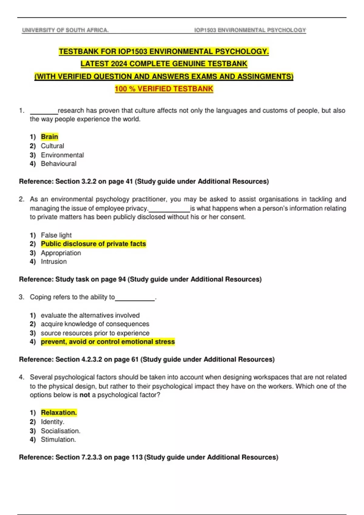 TESTBANK FOR IOP1503 ENVIRONMENTAL PSYCHOLOGY. LATEST 2024 COMPLETE GENUINE TESTBANK (WITH VERIFIED QUESTION AND ANSWERS EXAMS AND ASSINGMENTS) 100 % VERIFIED TESTBANK